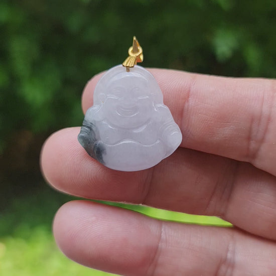 Natural Burmese Jadeite Jade Pendant – Icy Milky White & Emerald Green – Hand-Carved Happy Buddha Motif – JHB006