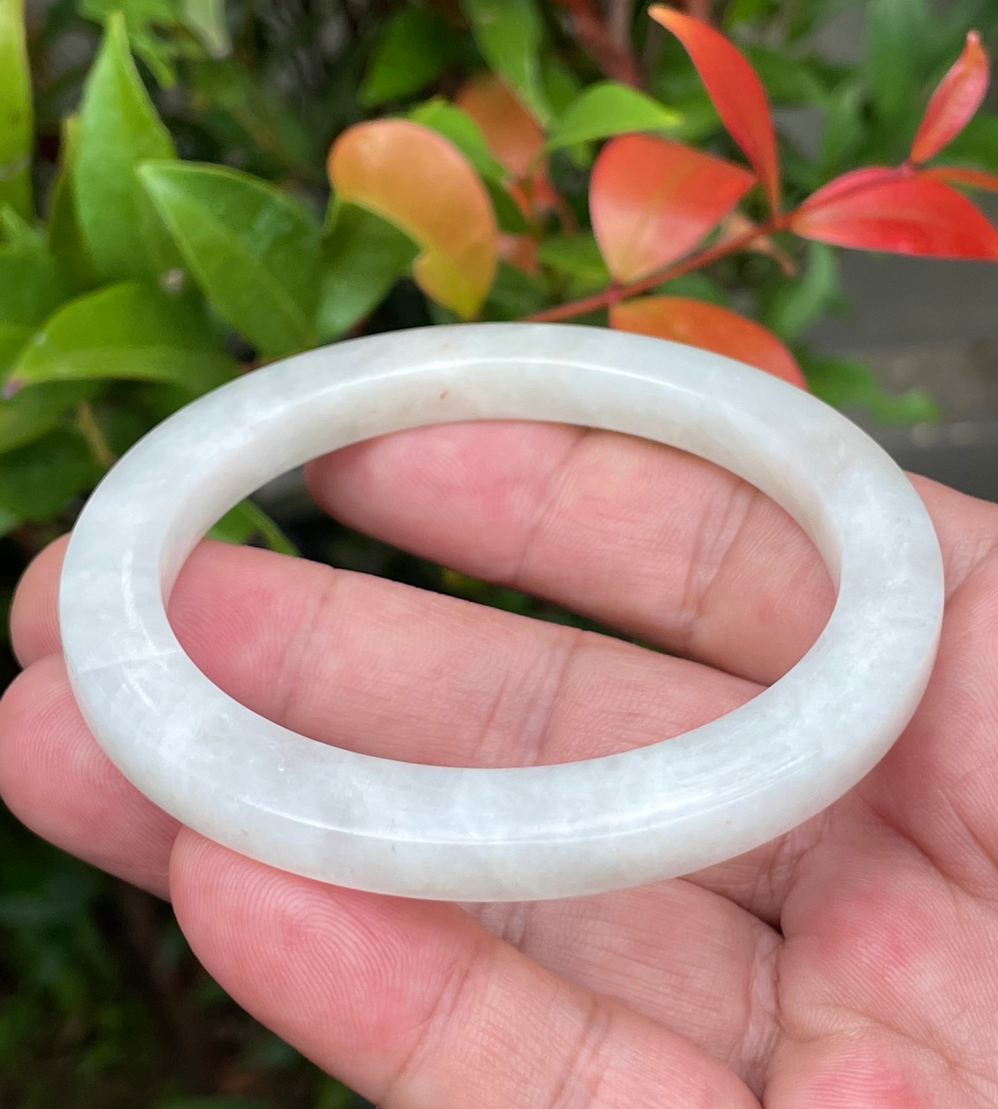 This jade bangle is handmade from 100% genuine and natural jadeite jade, ethically sourced from Myanmar (Burma)—the most esteemed origin for high-quality jadeite. It features a pure icy milky white tone with subtle cloudy marbling and a soft, glassy translucency throughout. Its flat inner and rounded outer design creates a modern silhouette while maintaining traditional elegance, perfect for stacking or wearing solo.