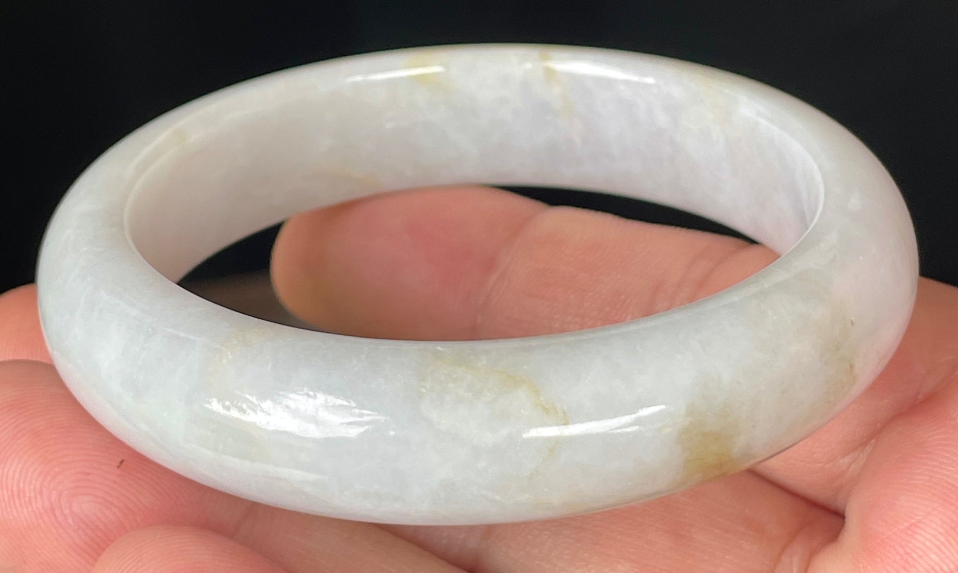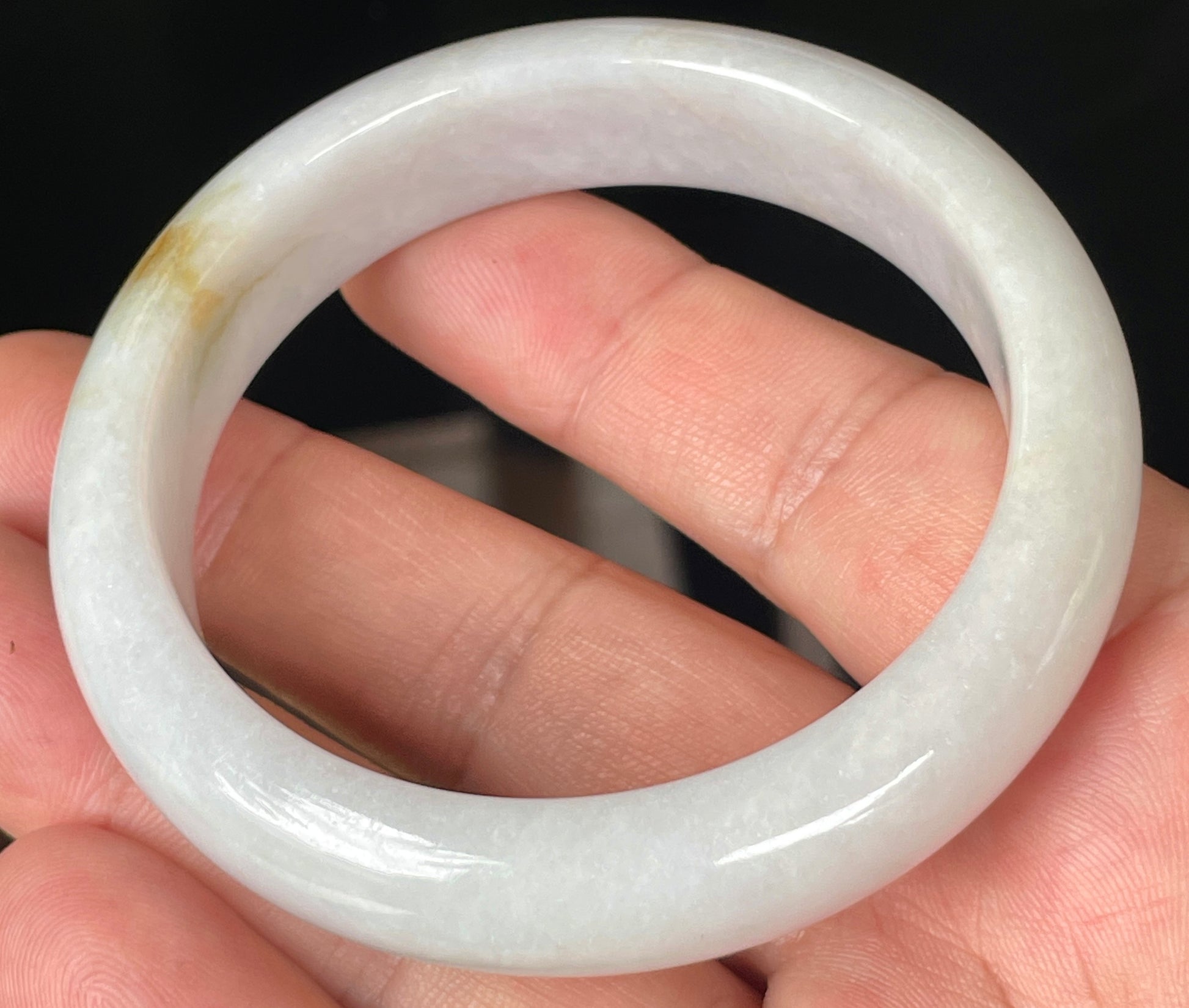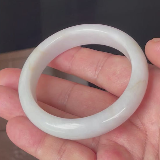 This certified jadeite jade bangle is exquisitely handcrafted from 100% genuine, natural Burmese jadeite. Its luminous body showcases a refined blend of icy light lavender and milky white, softly accented with delicate honey hues. The fine crystalline structure and glassy luster give this bangle a serene, semi-translucent glow in natural light.