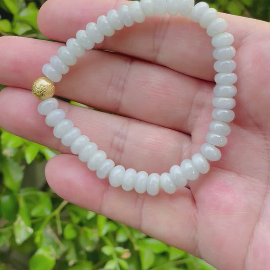 This bracelet is handcrafted from 100% genuine and natural jadeite jade, ethically sourced from Myanmar (Burma), the origin of the world’s most prized jadeite. It features elegant icy apple green beads with soft, icy undertones, arranged in a uniform row of smooth donut-shaped rondelles. A matte-textured golden bead adds a luxurious accent to this peaceful design.