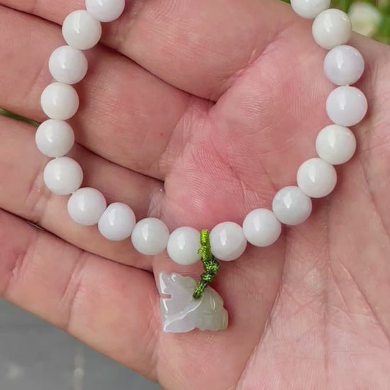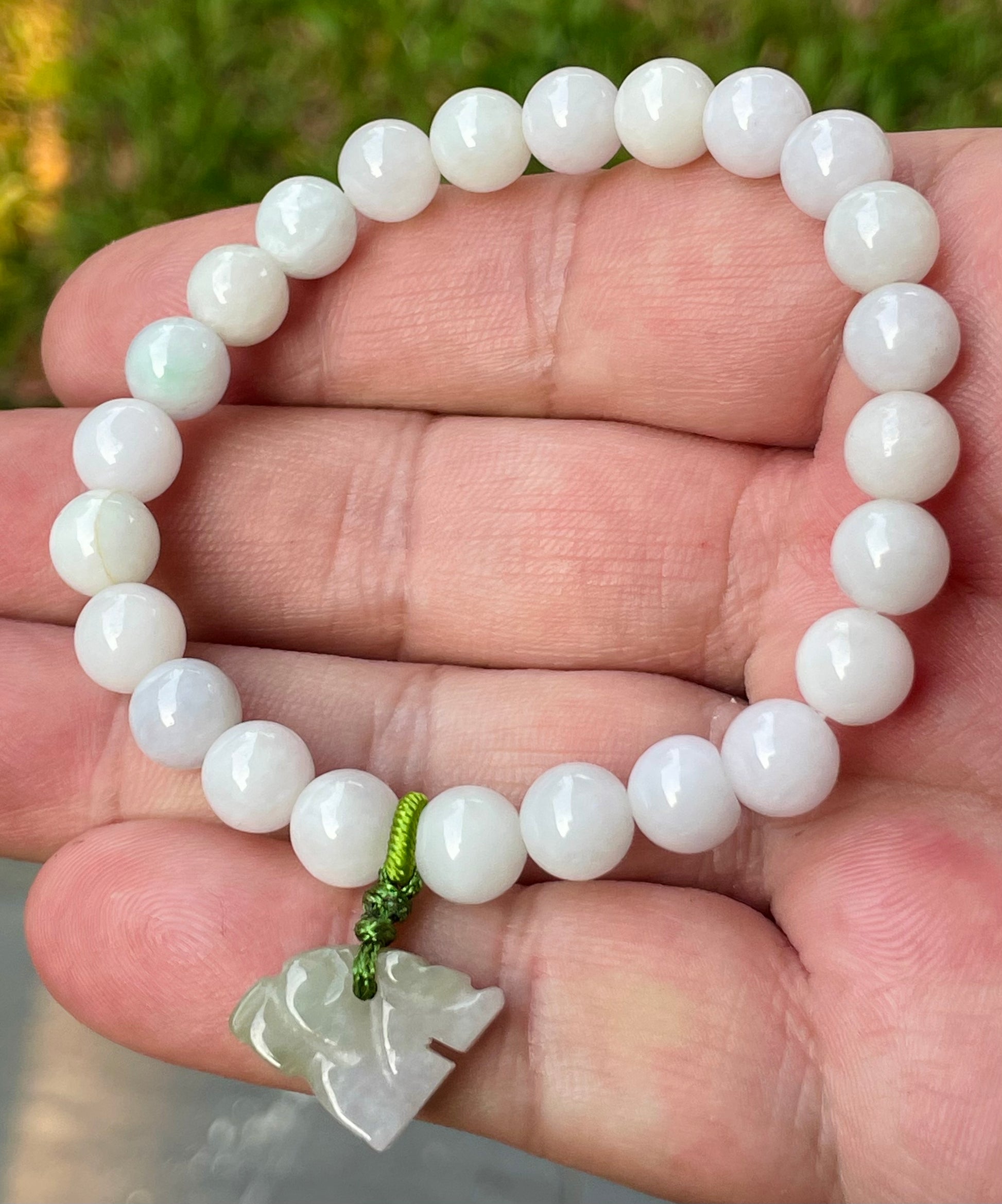 Natural Burmese Jadeite Jade Beaded Bracelet – Milky White, Light Lavender hues – Hand-Carved Tiger Pendant – 8mm – JBB177