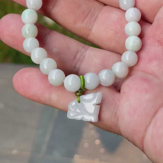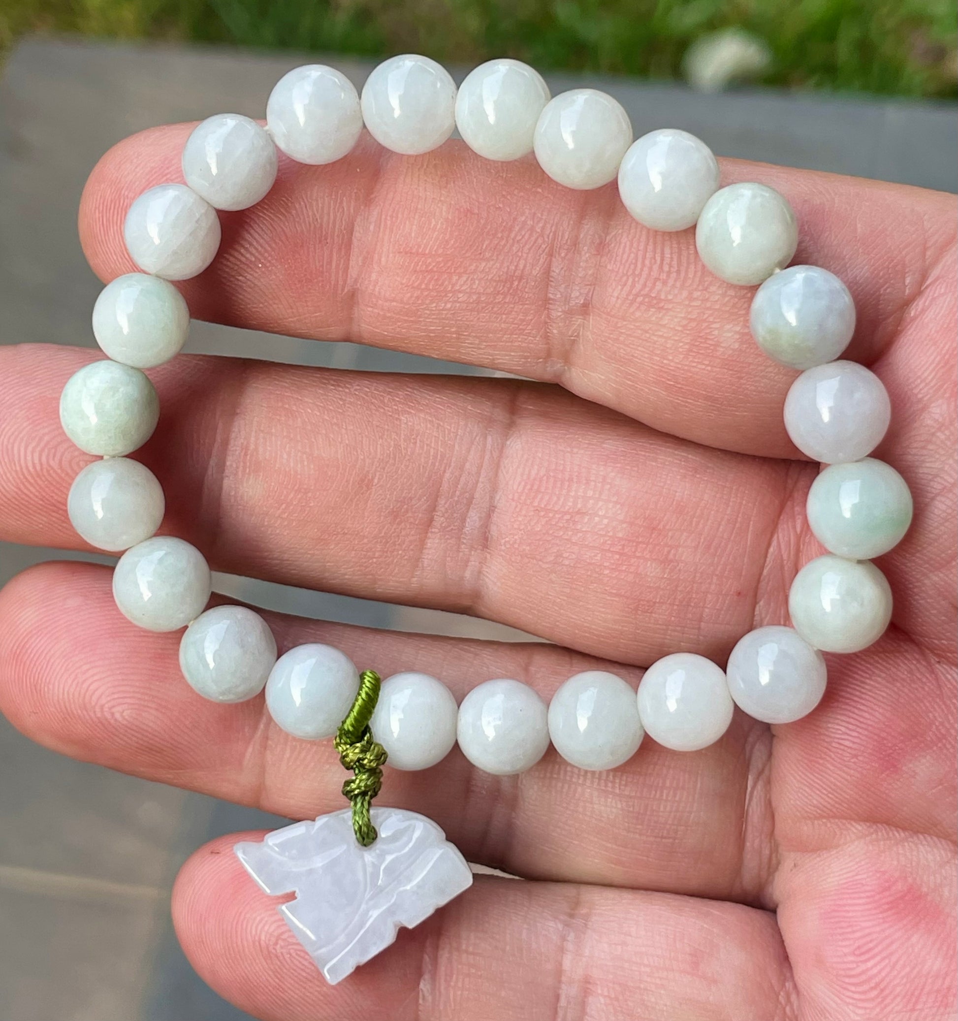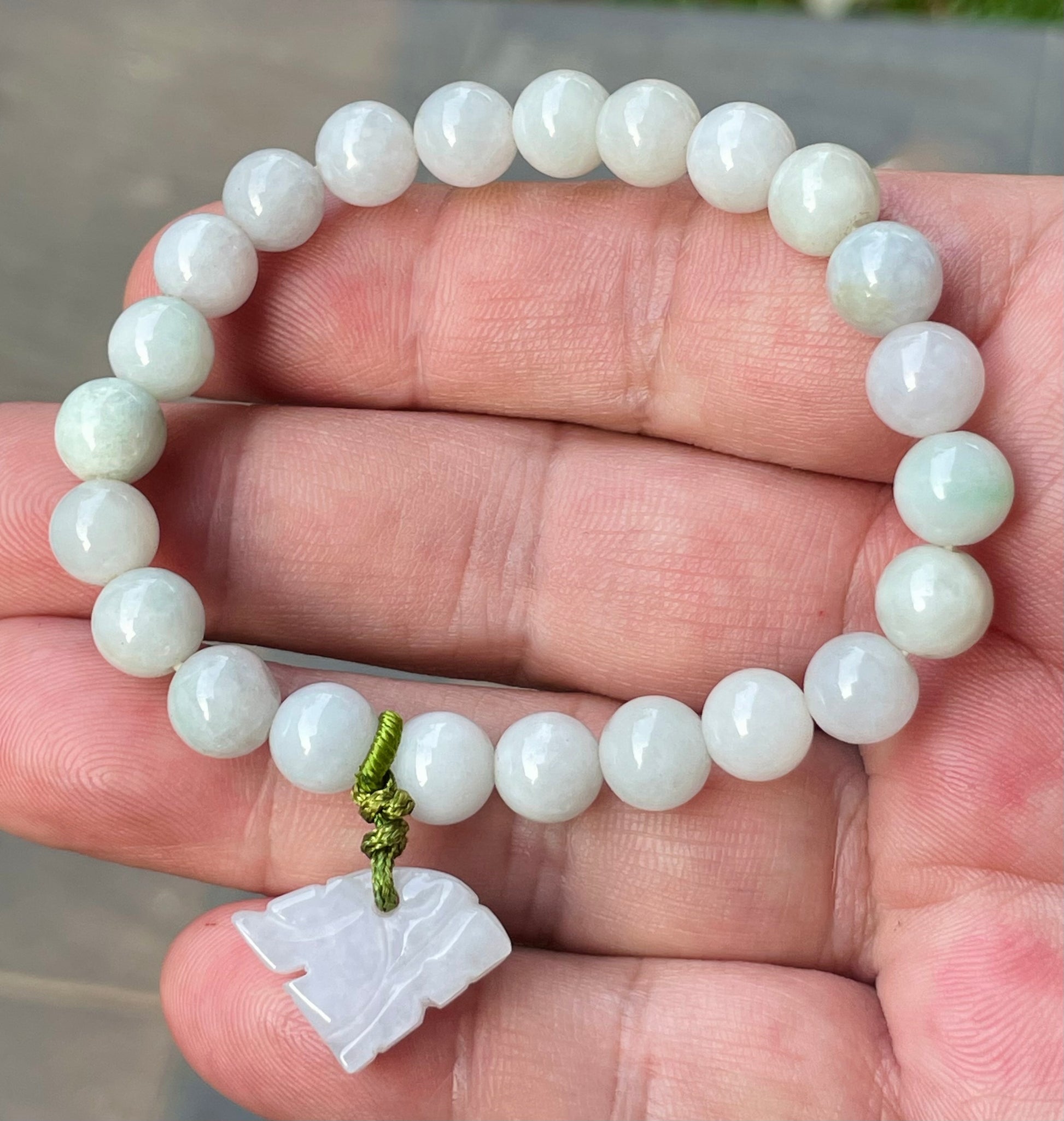 Natural Burmese Jadeite Jade Beaded Bracelet – Milky White, Faint Apple Green – Hand-Carved Tiger Pendant – 8mm – JBB180