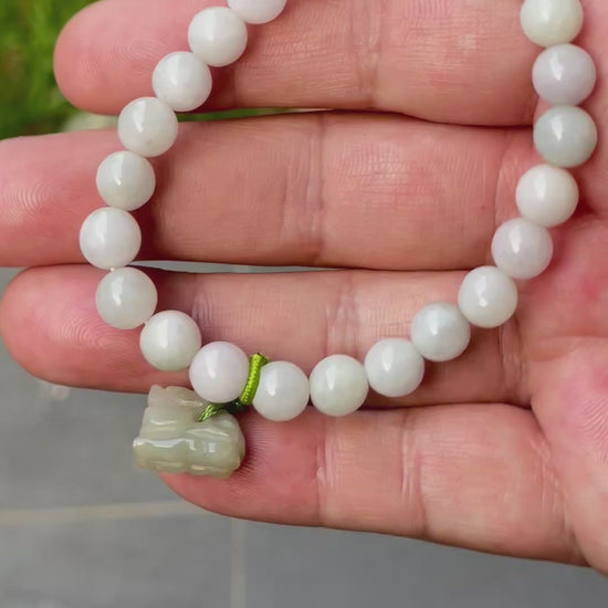 Natural Burmese Jadeite Jade Beaded Bracelet – Icy Milky White, Apple Green Hues – Hand-Carved Tiger Pendant – 8mm – JBB184