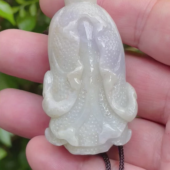 This unique pendant is hand-carved from natural Burmese jadeite jade into the shape of a gourd with flowing vines and seed details. In Chinese tradition, the gourd—known as “hulu”—is a powerful symbol of protection, good health, and prosperity, believed to ward off negativity while bringing blessings to the wearer. Its smooth polish and soft natural tones make it a meaningful and timeless piece of jewelry, perfect for everyday wear or as a thoughtful gift carrying wishes of luck, abundance, and longevity.