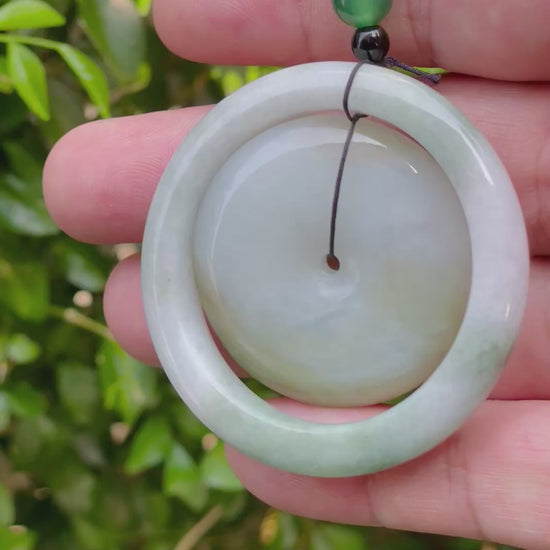 This jade pendant is crafted from 100% genuine and natural jadeite jade, ethically sourced from Myanmar (Burma)—the most prestigious origin of fine jadeite. It showcases a soft blend of milky white and light green, forming an elegant gradient with a subtle translucency and natural variations in texture.