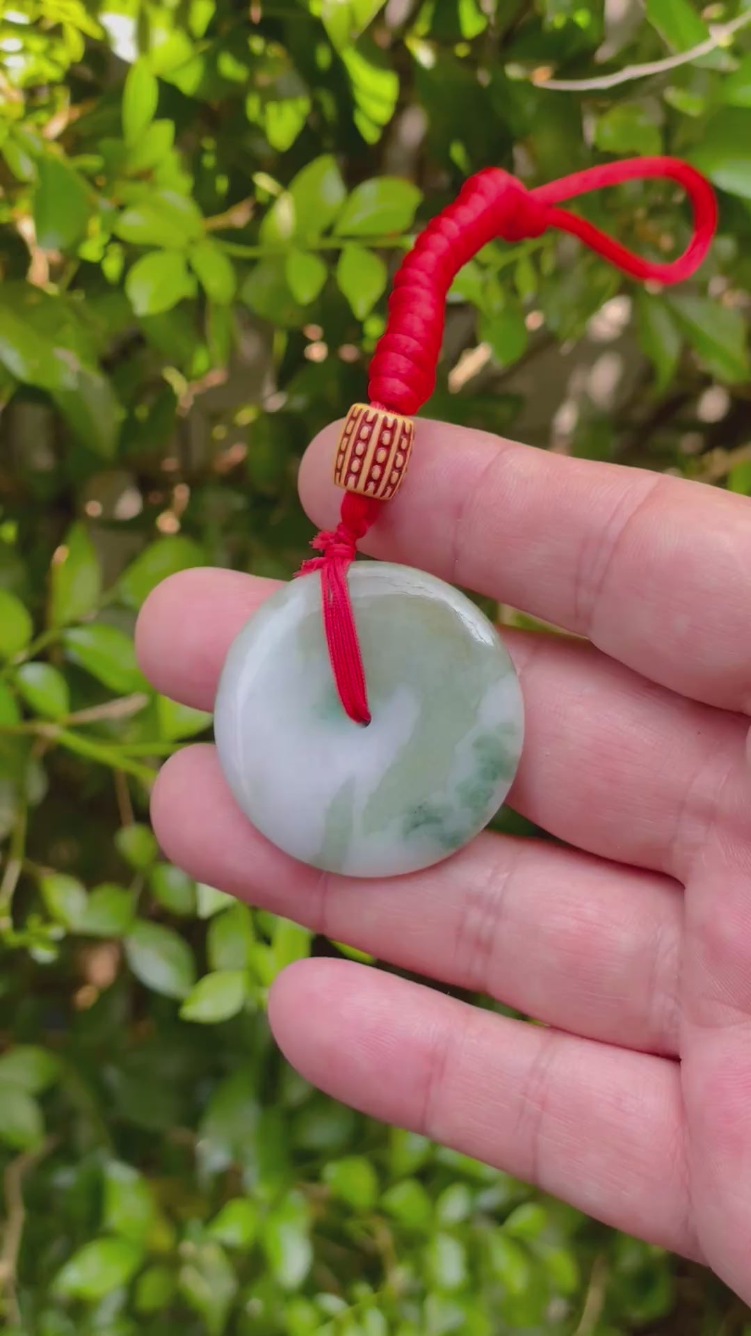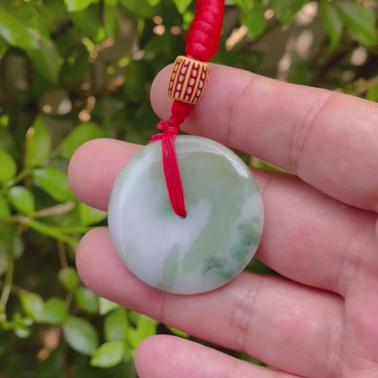 This pendant is handcrafted from 100% genuine and natural jadeite jade, ethically sourced from Myanmar (Burma)—home to the finest quality jadeite in the world. It features a classic round "pi" disc shape with a smooth polish and a tranquil blend of forest green and milky white tones. The swirling colors resemble mist across a mountainside, giving this piece a natural harmony and depth.
