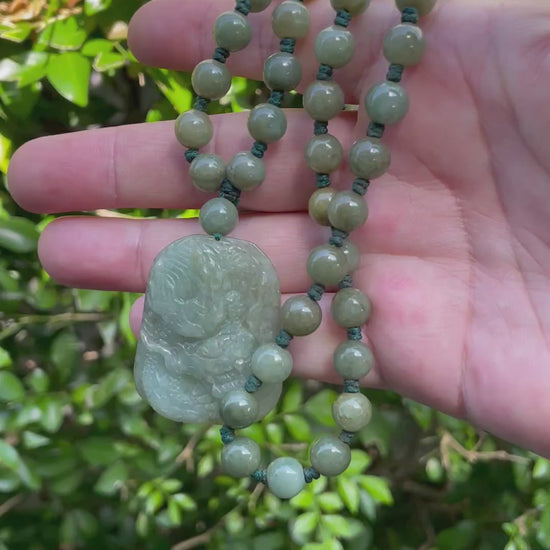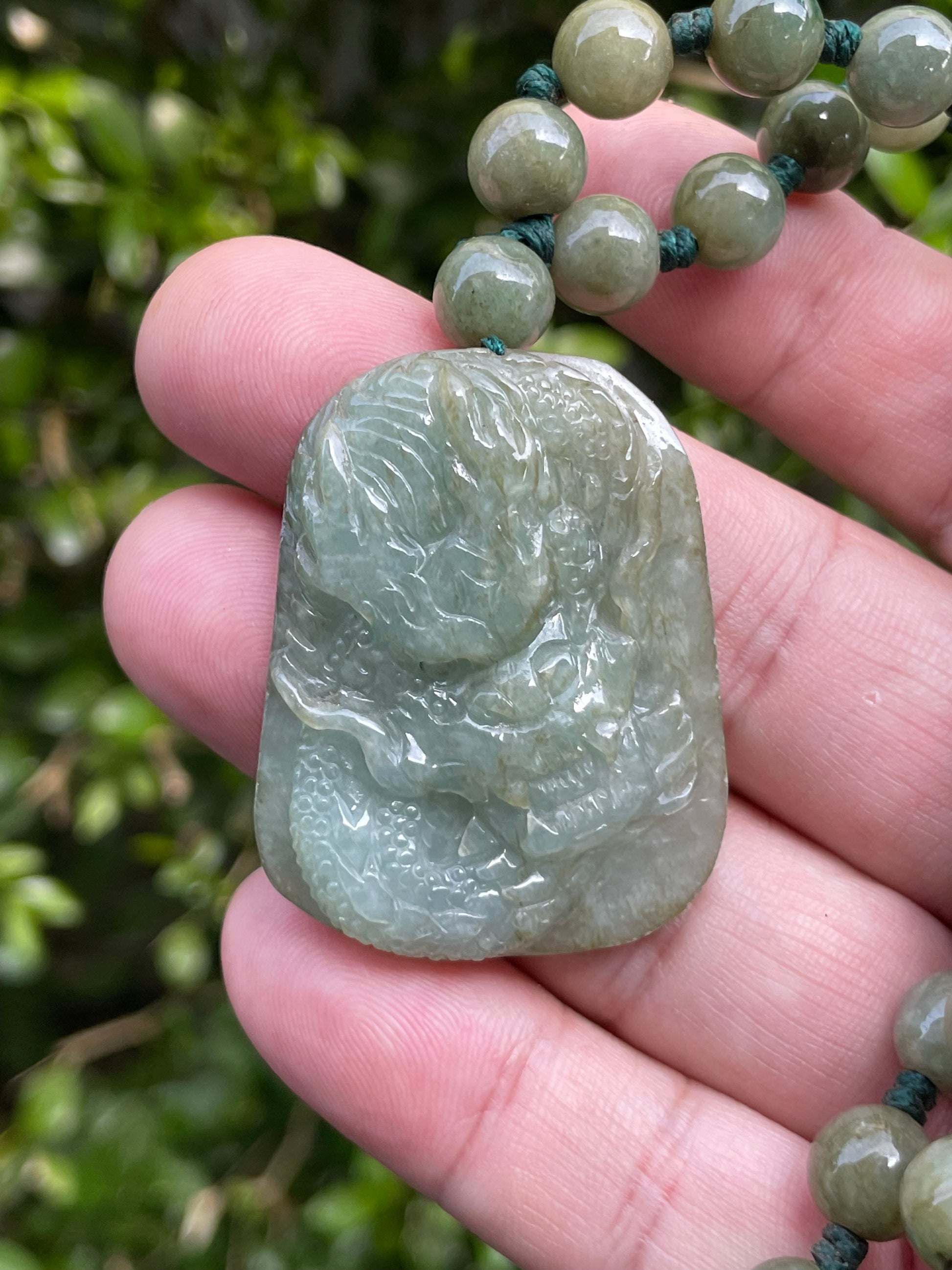 Expertly hand-carved with a dragon motif, the piece captures movement and energy in fine detail—from the coiled body to the flowing mane. It is strung on a hand-knotted jadeite beaded necklace composed of polished green beads, creating a balanced and complete piece ready to wear.