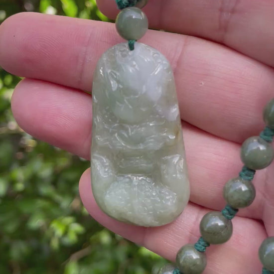 Intricately hand-carved with a powerful dragon motif, this piece represents protection, vitality, and prosperity. The pendant is paired with a hand-knotted beaded jadeite necklace, crafted with smooth green jadeite beads and strong thread, making it comfortable and ready to wear right out of the box.
