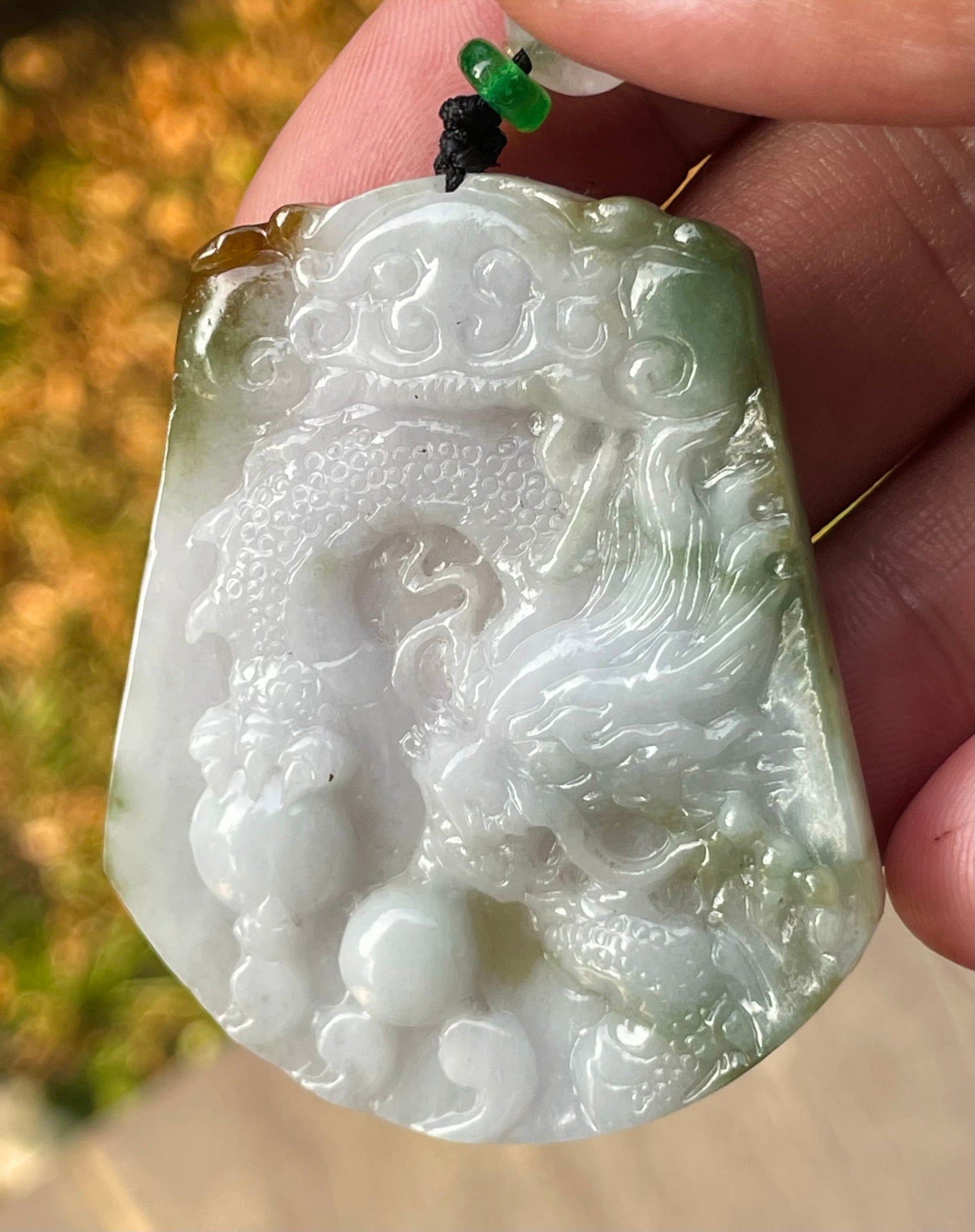 This jade pendant is carved from 100% genuine and natural jadeite jade, ethically sourced from Myanmar (Burma)—the most esteemed origin for high-quality jadeite. It features a glowing combination of milky white with touches of imperial green and golden brown, displaying natural inclusions and a soft, smooth translucency. This piece is masterfully hand-carved with a powerful dragon, symbolizing authority and protection.