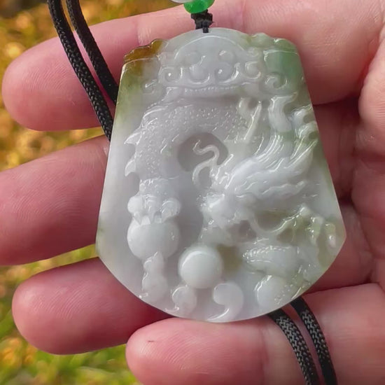 Natural Certified Burmese Jadeite Jade Pendant – Green & Milky White – Hand-Carved Dragon Motif – Necklace Included – JP081