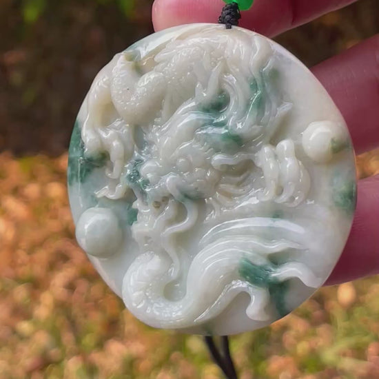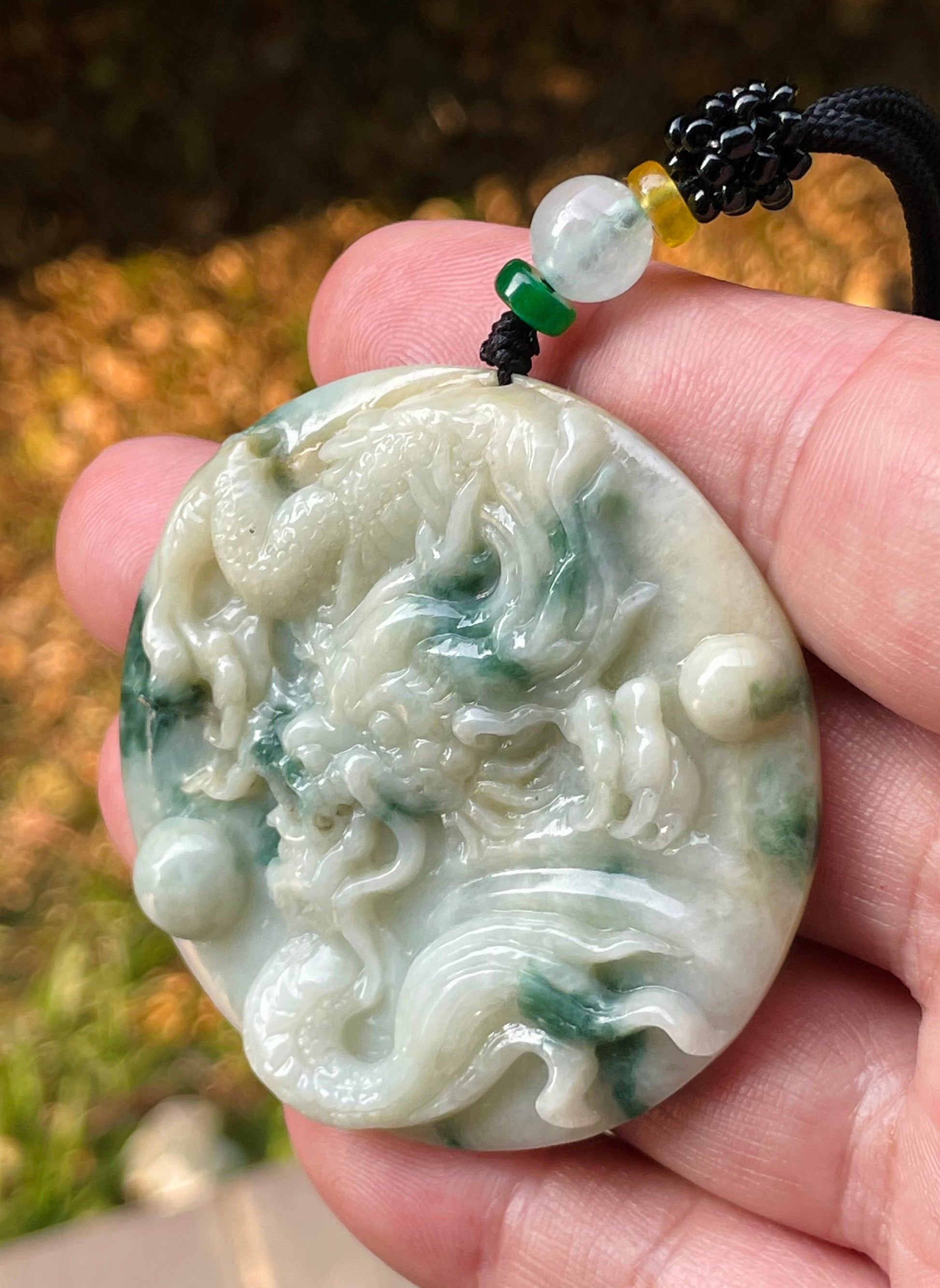 This jade pendant is carved from 100% genuine and natural jadeite jade, ethically sourced from Myanmar (Burma)—the most esteemed origin for high-quality jadeite. It features a luminous blend of imperial green and milky white tones, with natural inclusions and a soft translucency. This piece is masterfully hand-carved with a dragon, resulting in a pendant that radiates both symbolic meaning and traditional craftsmanship.