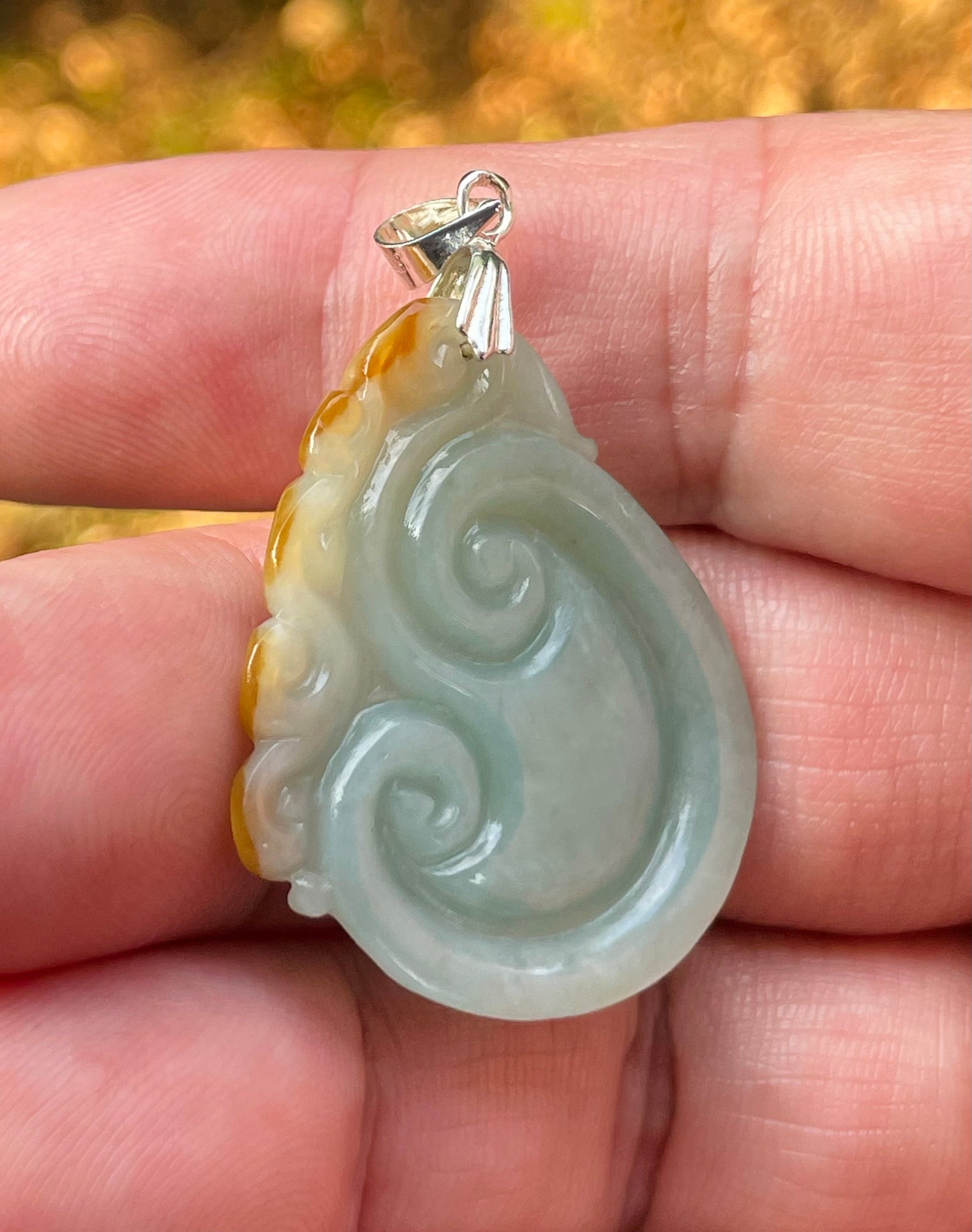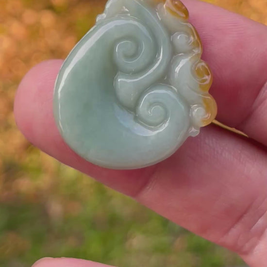 This pendant is carved from 100% genuine and natural jadeite jade, ethically sourced from Myanmar (Burma)—the most esteemed origin for high-quality jadeite. It features imperial green tones with warm honey-colored accents, masterfully shaped into a flowing Ruyi cloud swirl motif.