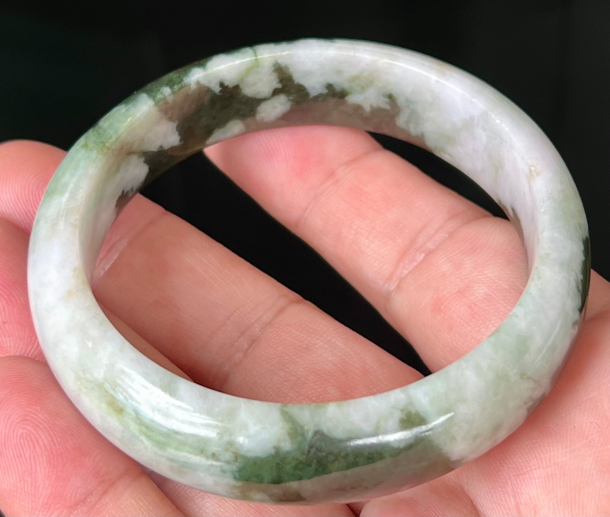 This natural jadeite jade bangle is hand-carved from 100% genuine, natural Burmese jadeite. It showcases a vibrant blend of icy apple and deep forest green hues, beautifully marbled with soft milky white tones. The semi-translucent, crystalline texture creates an ethereal glow that dances with the light, giving the bangle a fresh and tranquil appearance. Rich forest greens flow into serene whites, evoking lush jade mountains and cool misty mornings.