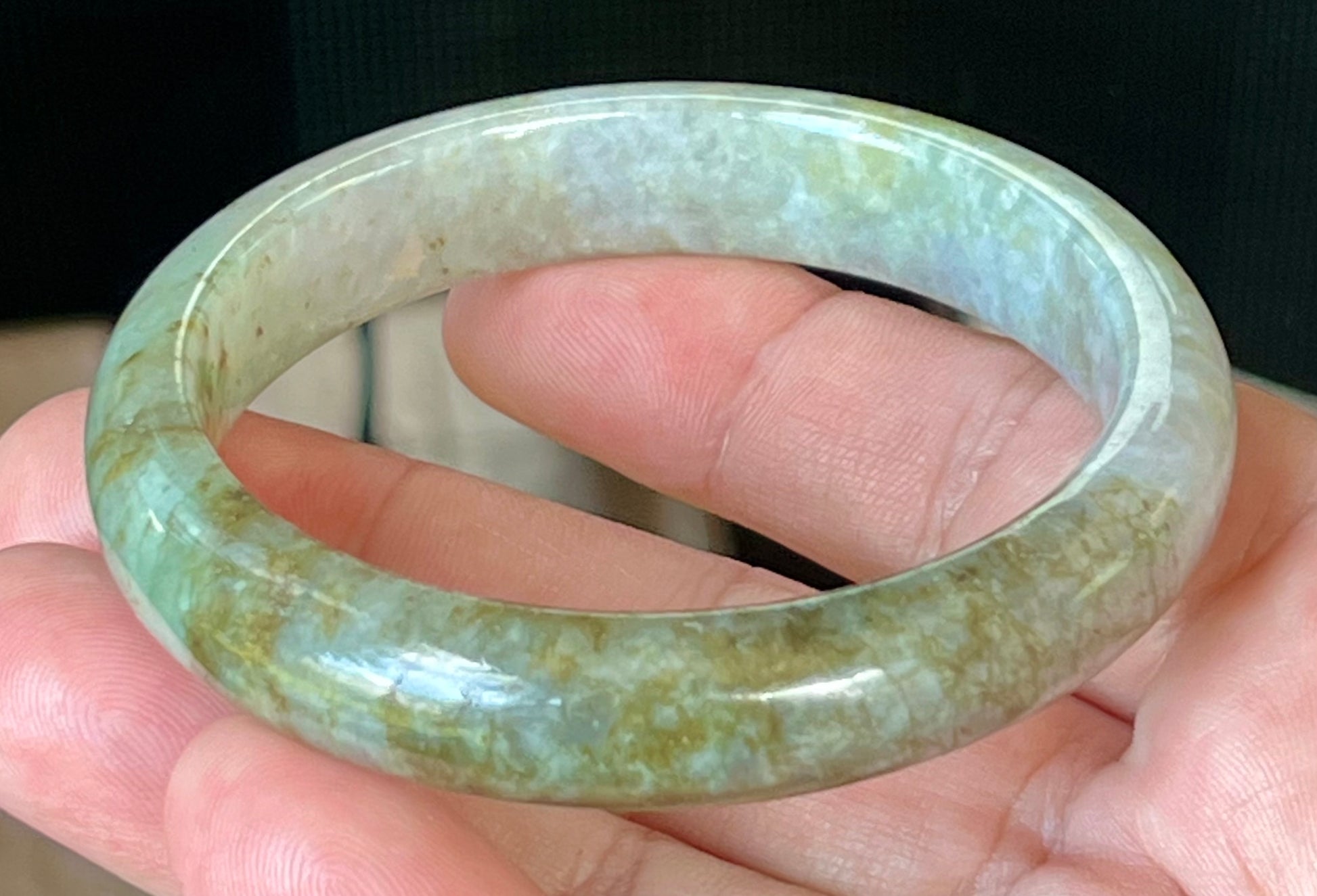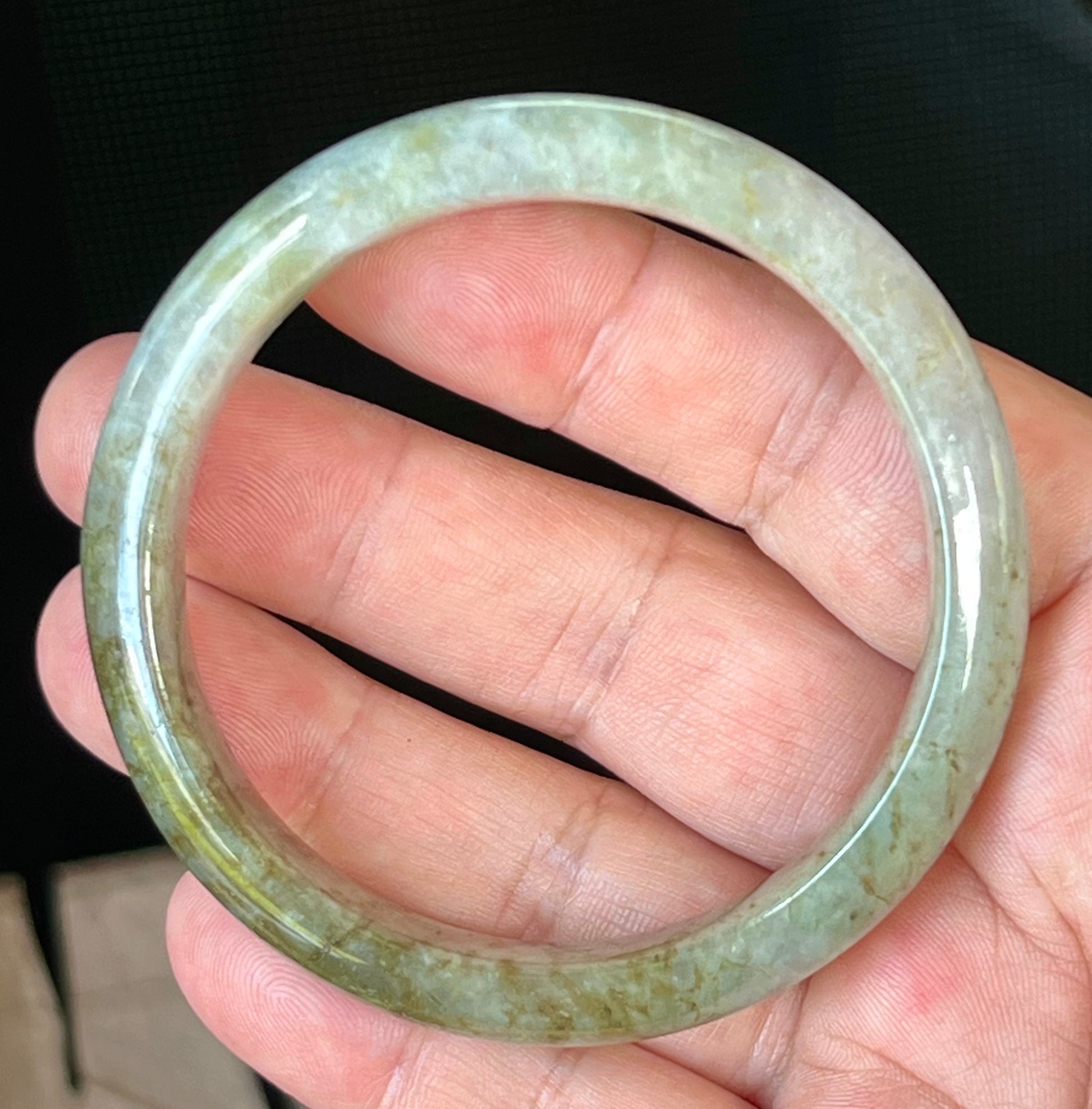 Natural Burmese Jadeite Jade Bangle – Icy Grayish Milky White with Forest Green & Honey Hues – 58.8mm – JB512
