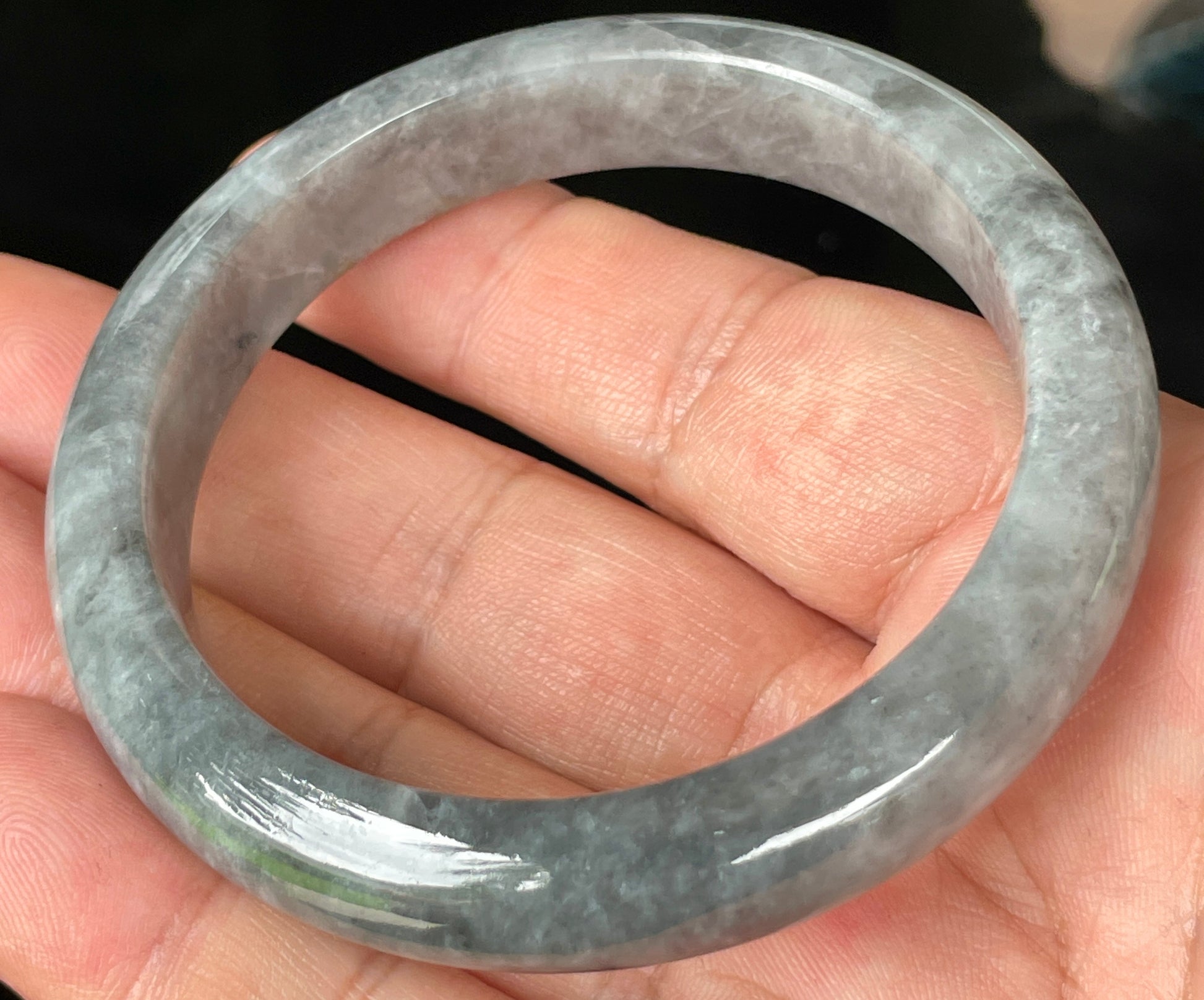 This natural jadeite jade bangle is beautifully handcrafted from 100% genuine, natural Burmese jadeite. It features an elegant blend of icy grey and misty milky white, softly accented by subtle honey hues. The semi-translucent, fine crystalline texture and glassy luster shimmer beautifully in natural light, highlighting every swirl and marbling unique to this one-of-a-kind piece.