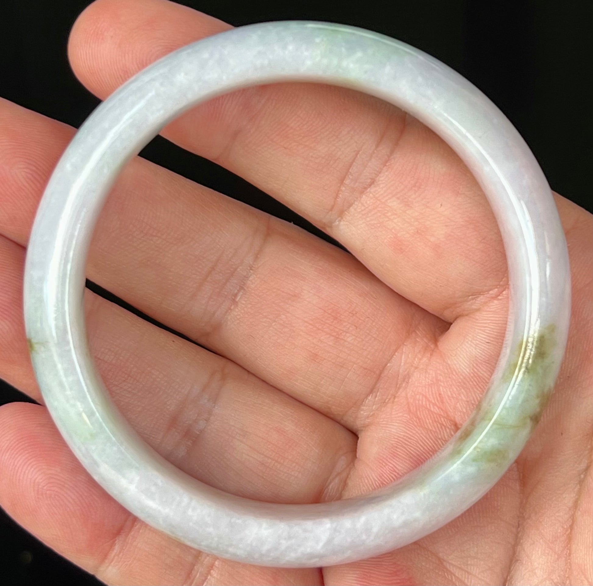 This natural jadeite jade bangle is beautifully handcrafted from 100% genuine, natural Burmese jadeite. It features an elegant blend of icy greyish milky white, highlighted by soft apple green and gentle honey hues. The semi-translucent, crystalline texture creates a glowing luster that shifts beautifully in natural light. The soothing combination of colors evokes a sense of calm, renewal, and understated luxury.