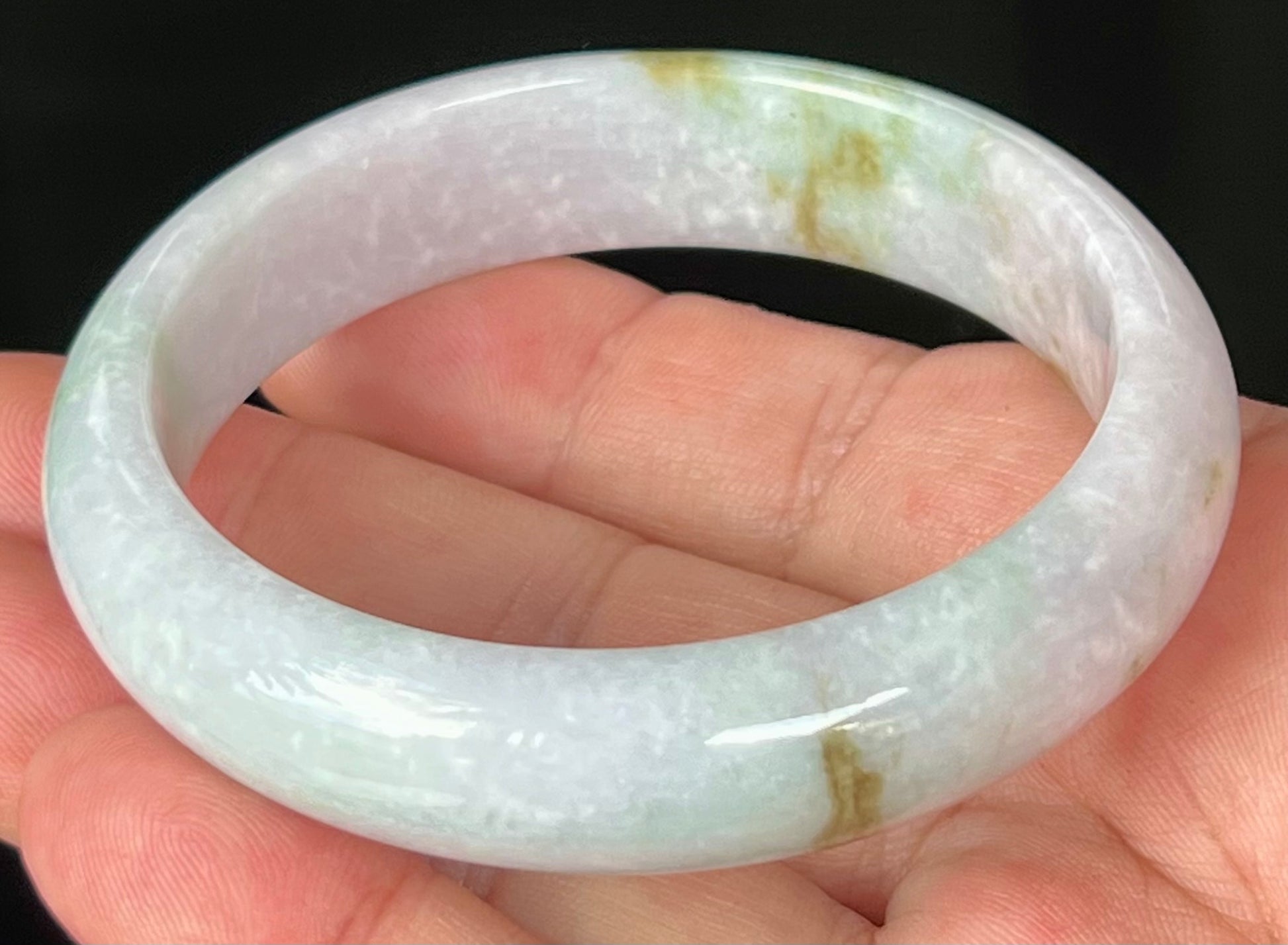 Natural Burmese Jadeite Jade Bangle – Icy Greyish Milky White with Apple Green and Honey Hues – 58.2mm – JB534