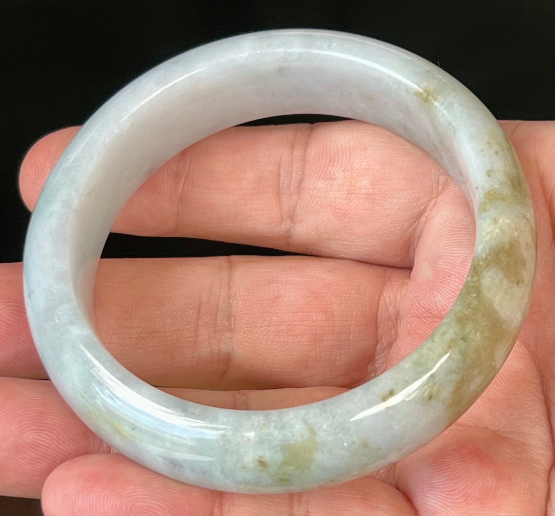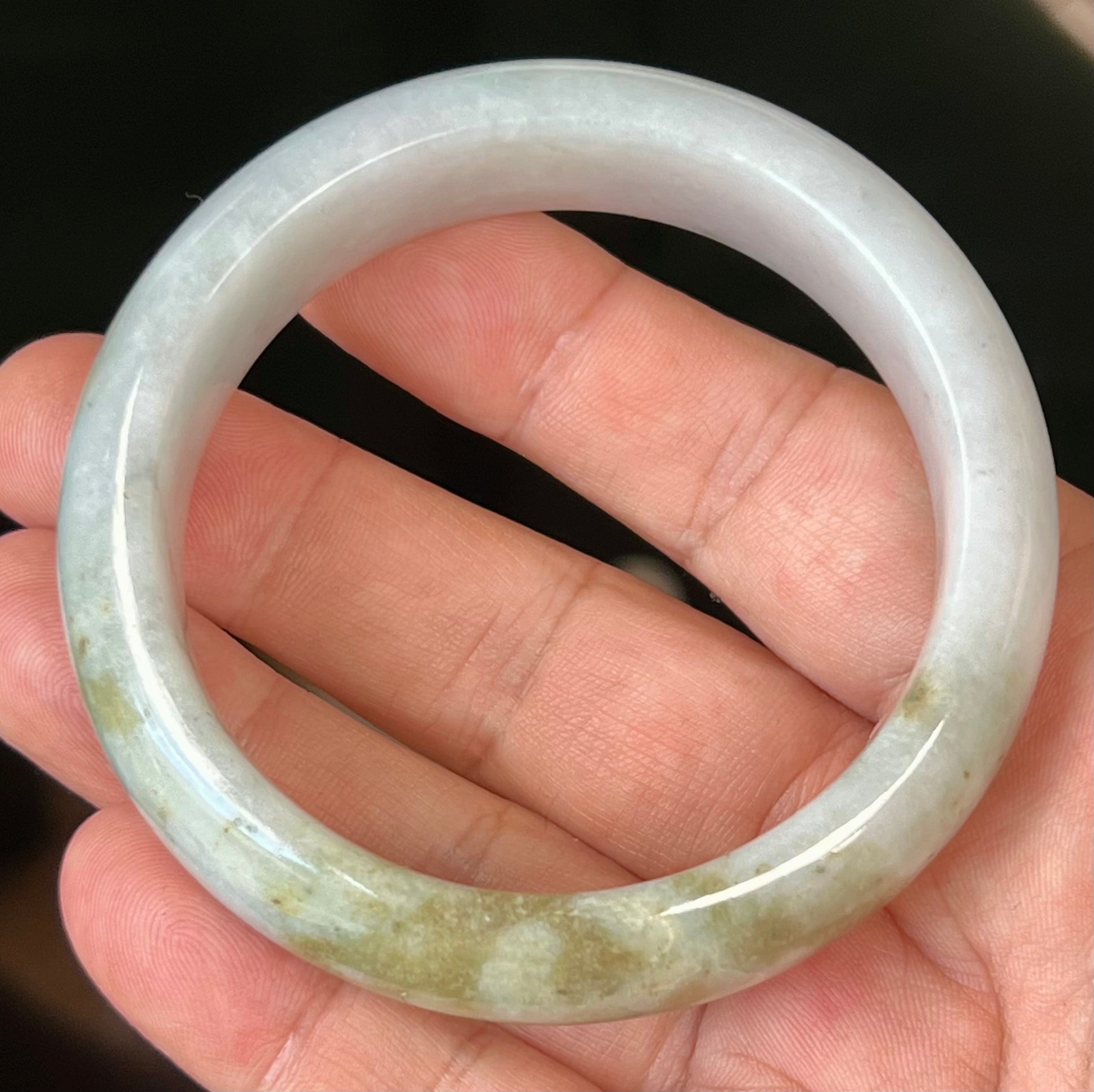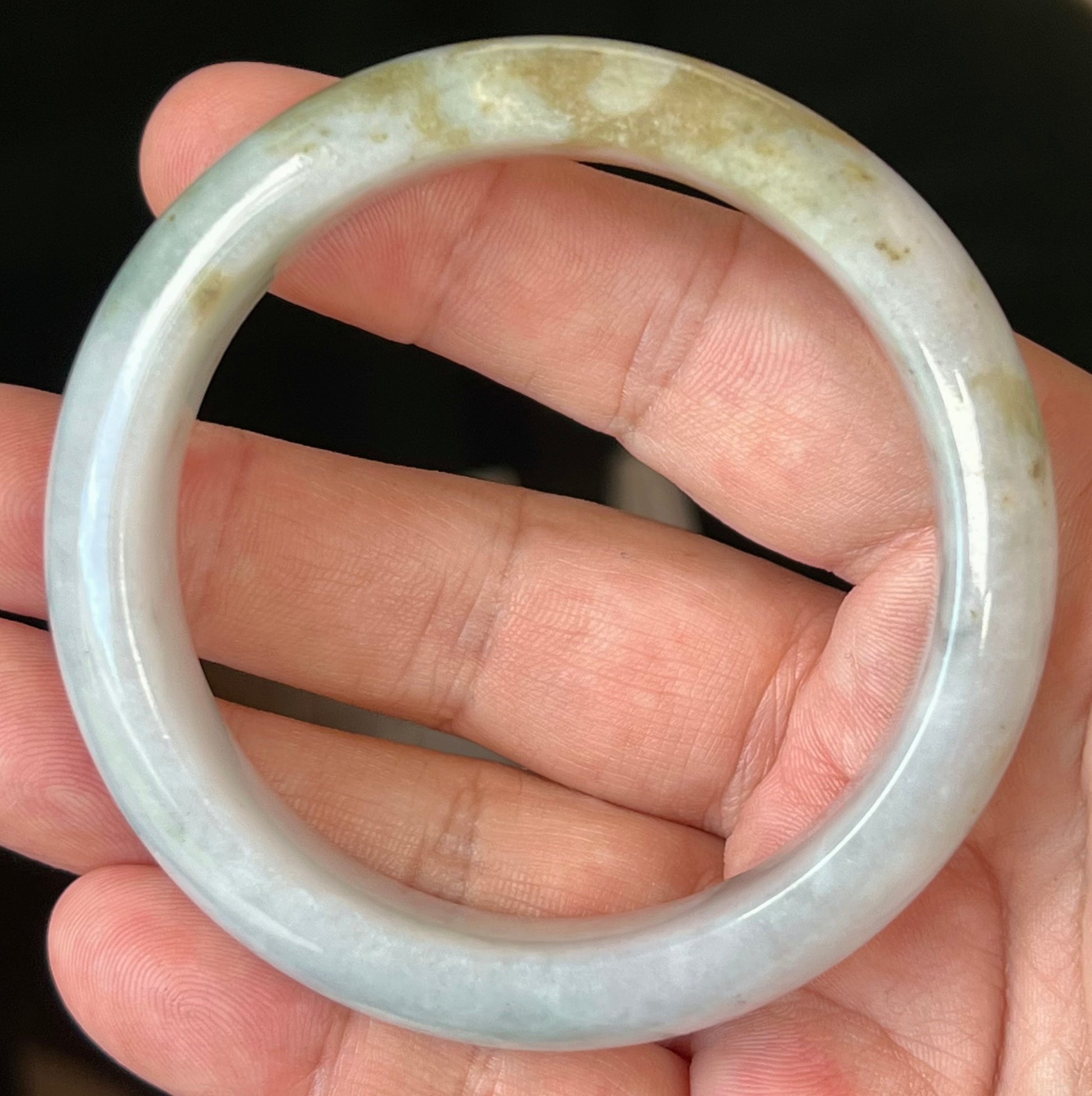 Natural Burmese Jadeite Jade Bangle – Icy Greyish Milky White with Moss Green and Honey Hues – 59mm – JB546