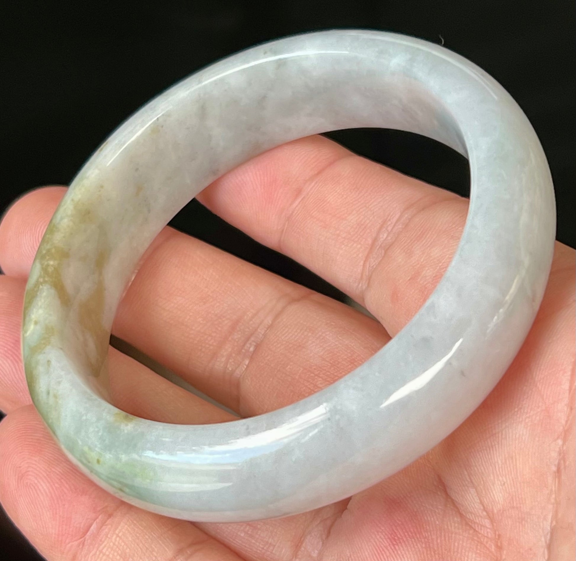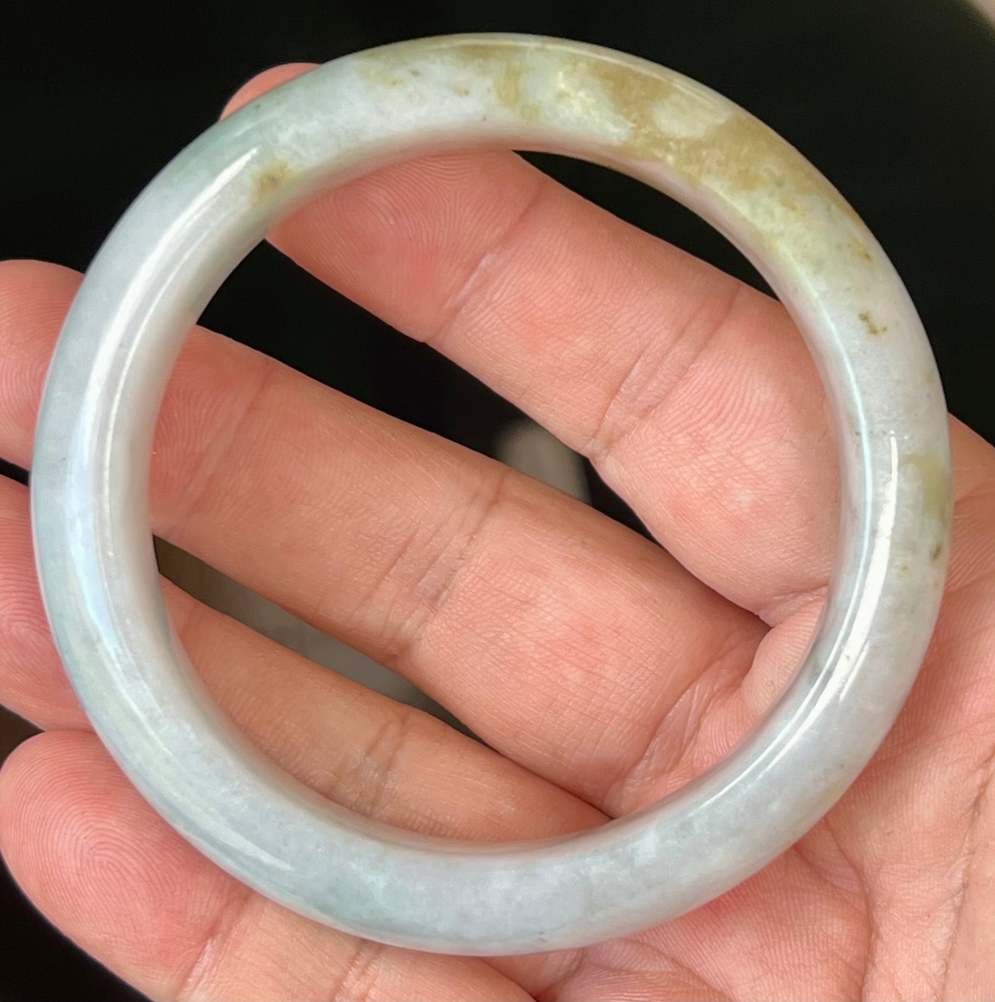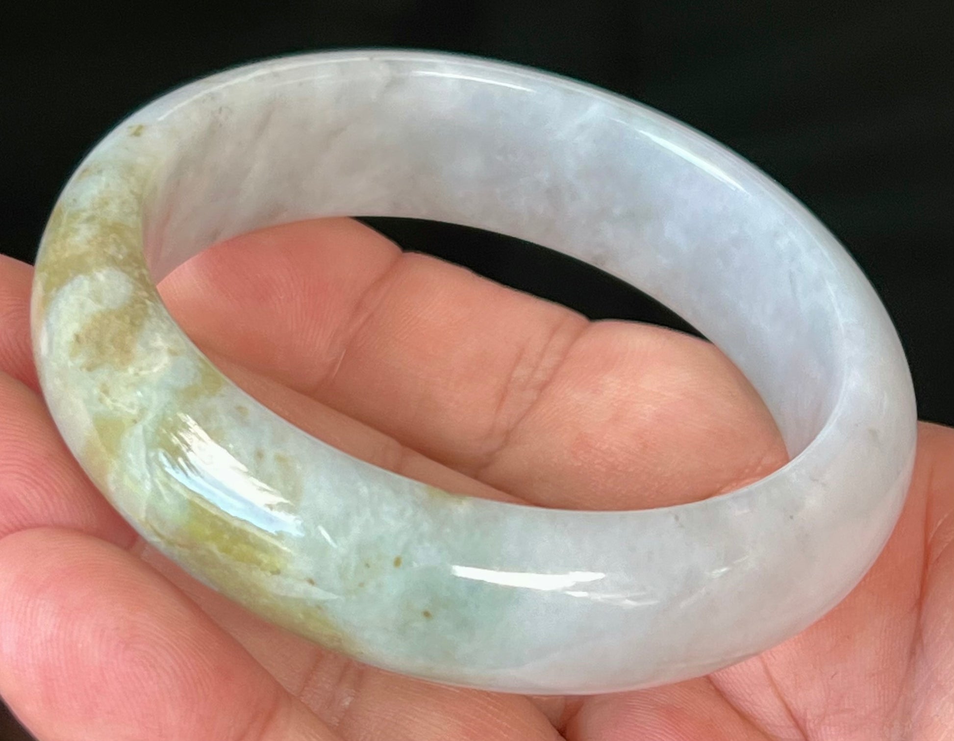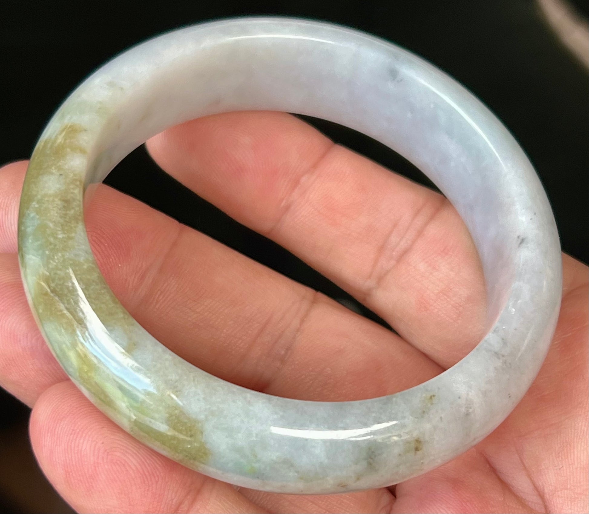 Natural Burmese Jadeite Jade Bangle – Icy Greyish Milky White with Moss Green and Honey Hues – 59mm – JB546