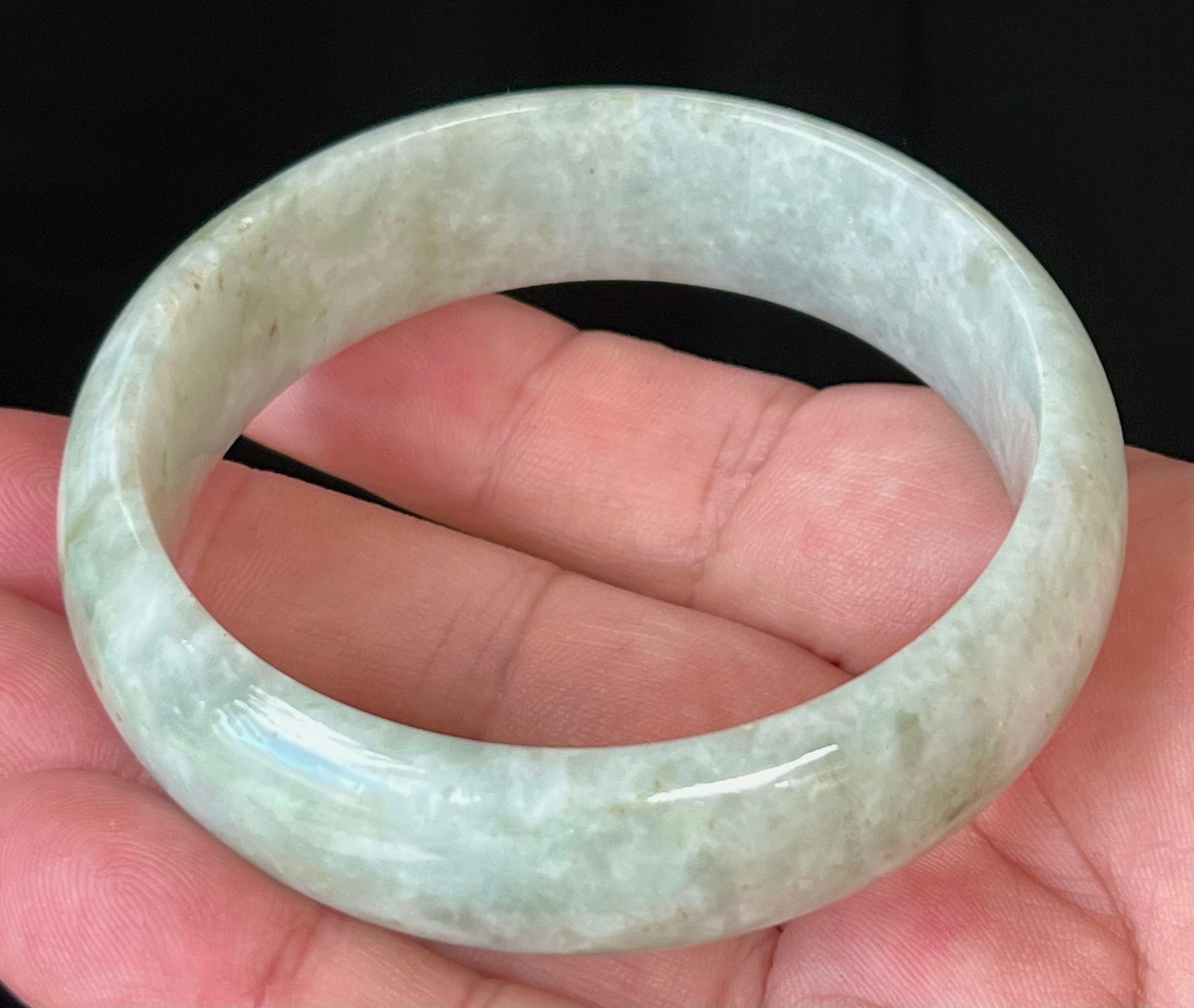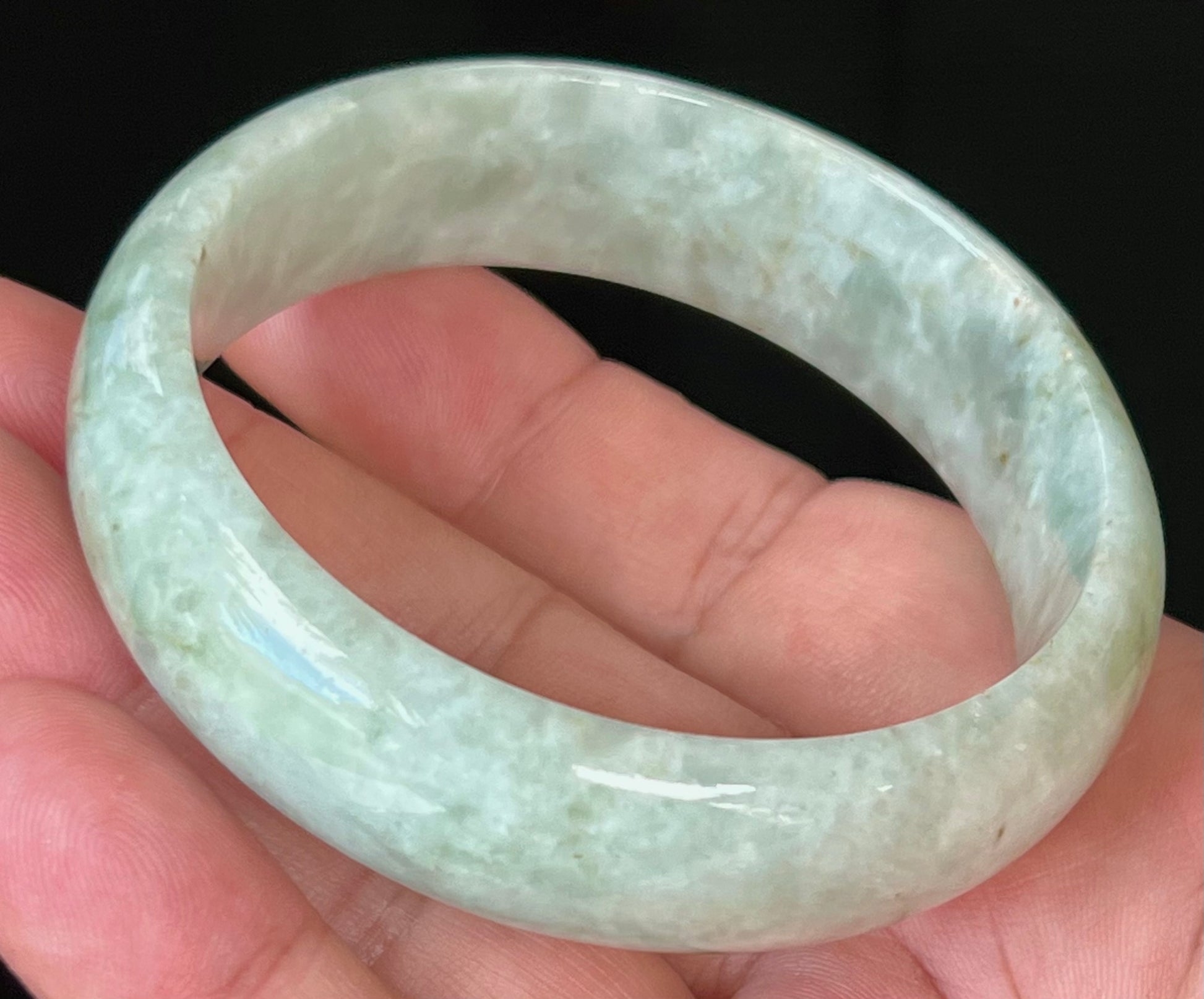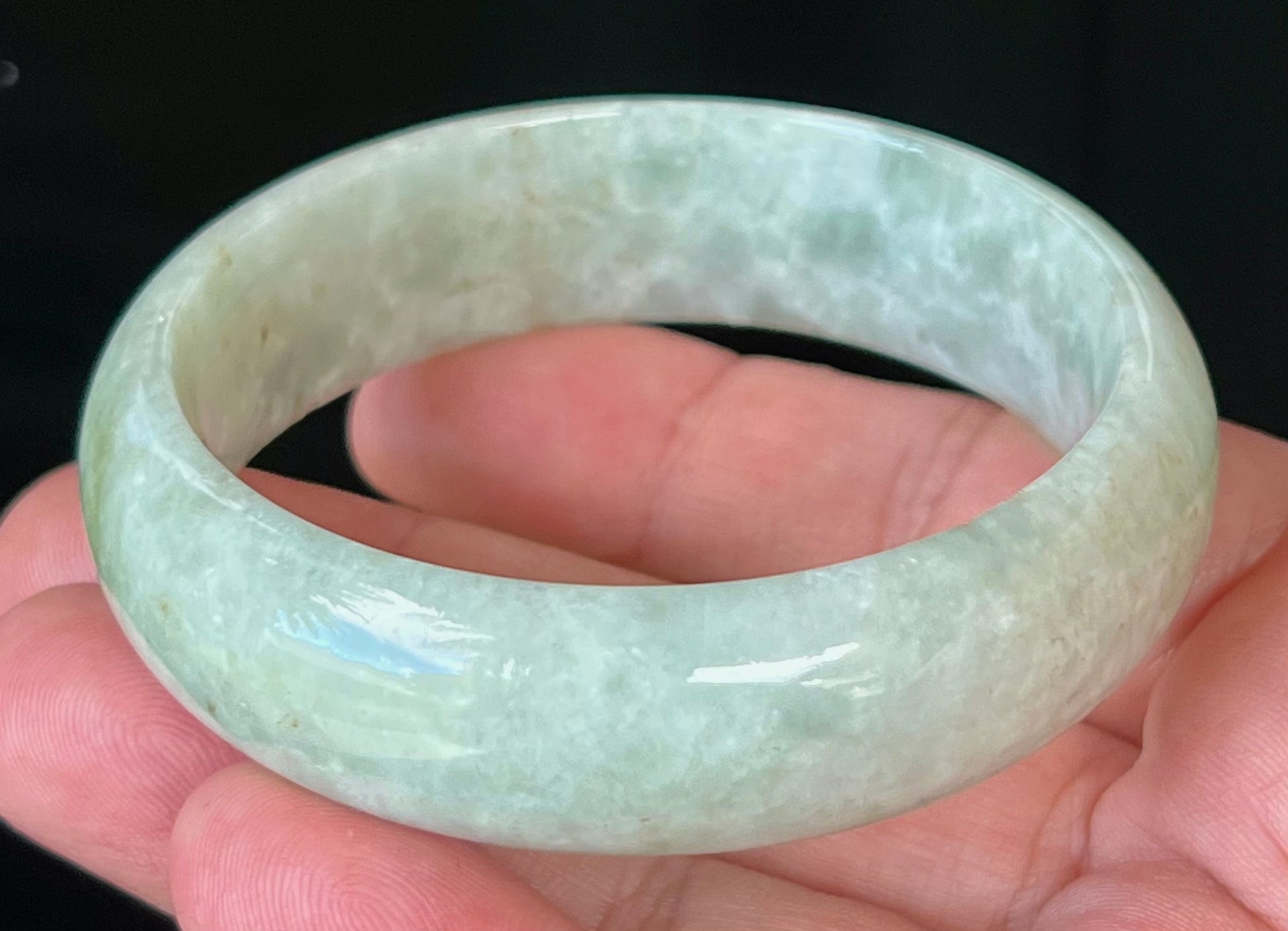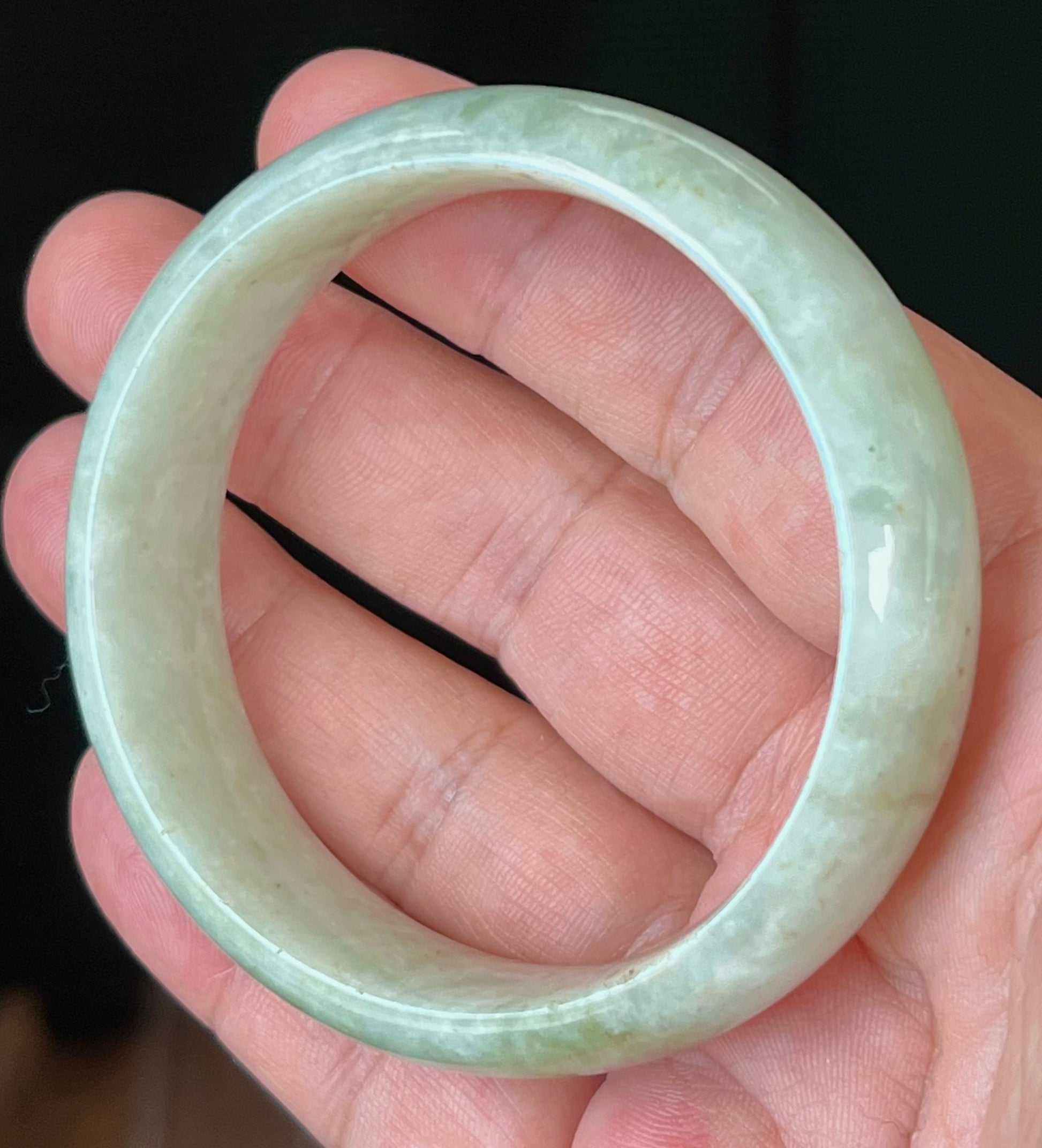 This natural jadeite jade bangle is skillfully handcrafted from 100% genuine, natural Burmese jadeite. It showcases an elegant blend of icy milky white and soothing apple green hues, creating a soft and luminous look reminiscent of early morning mist over lush orchards. The semi-translucent crystalline texture and smooth, glassy luster give this piece a timeless, understated elegance.