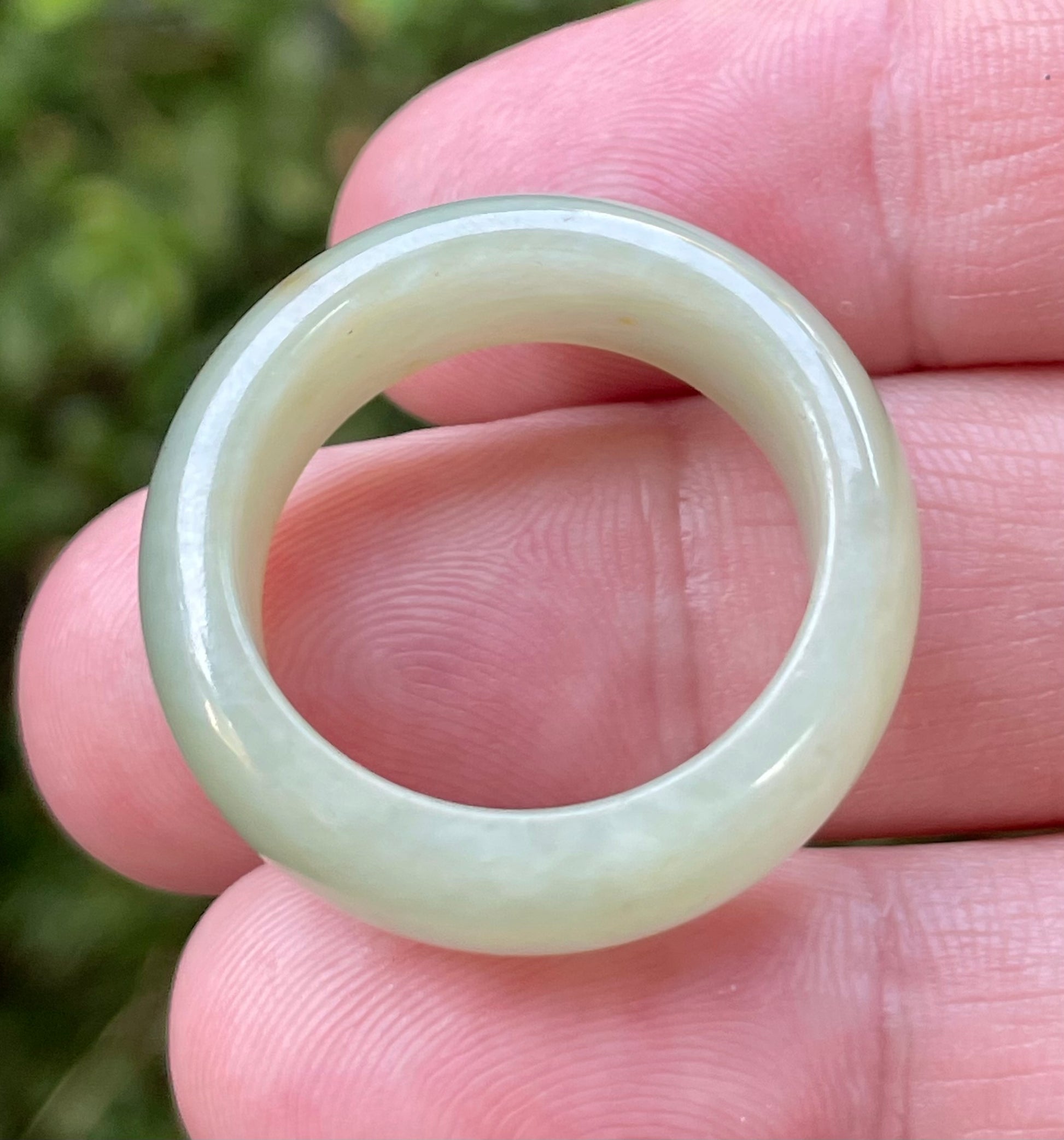 This rare and luminous jadeite jade ring is hand-carved in the large round ring style from genuine, natural Burmese jadeite. It features a soothing blend of icy apple green with delicate honey tones, beautifully swirled throughout a semi-translucent base. The interior and exterior are smoothly rounded and expertly polished, offering a bold yet comfortable fit—ideal as a statement piece or for everyday elegance.