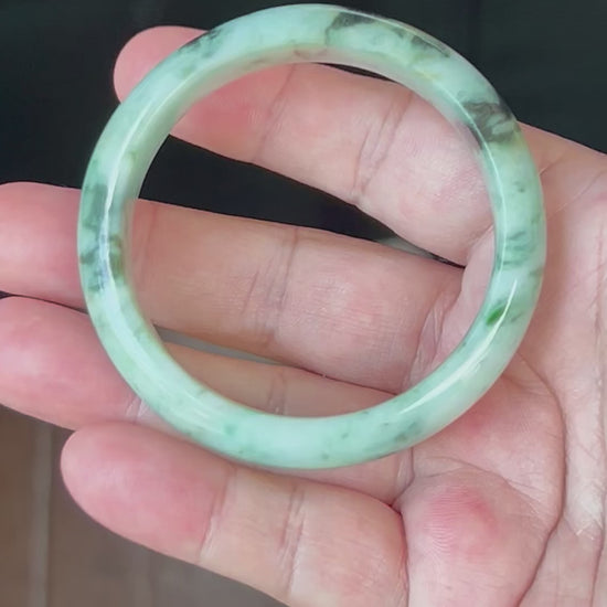 This certified jadeite jade bangle is masterfully handcrafted from 100% natural Burmese jadeite, showcasing a stunning icy translucent base with vivid apple and deep forest green hues. Wisps of black and honey tones flow throughout the stone, creating a lively and sophisticated look. The surface is beautifully polished to a glassy finish, allowing the natural colors and textures to shine through with every movement.