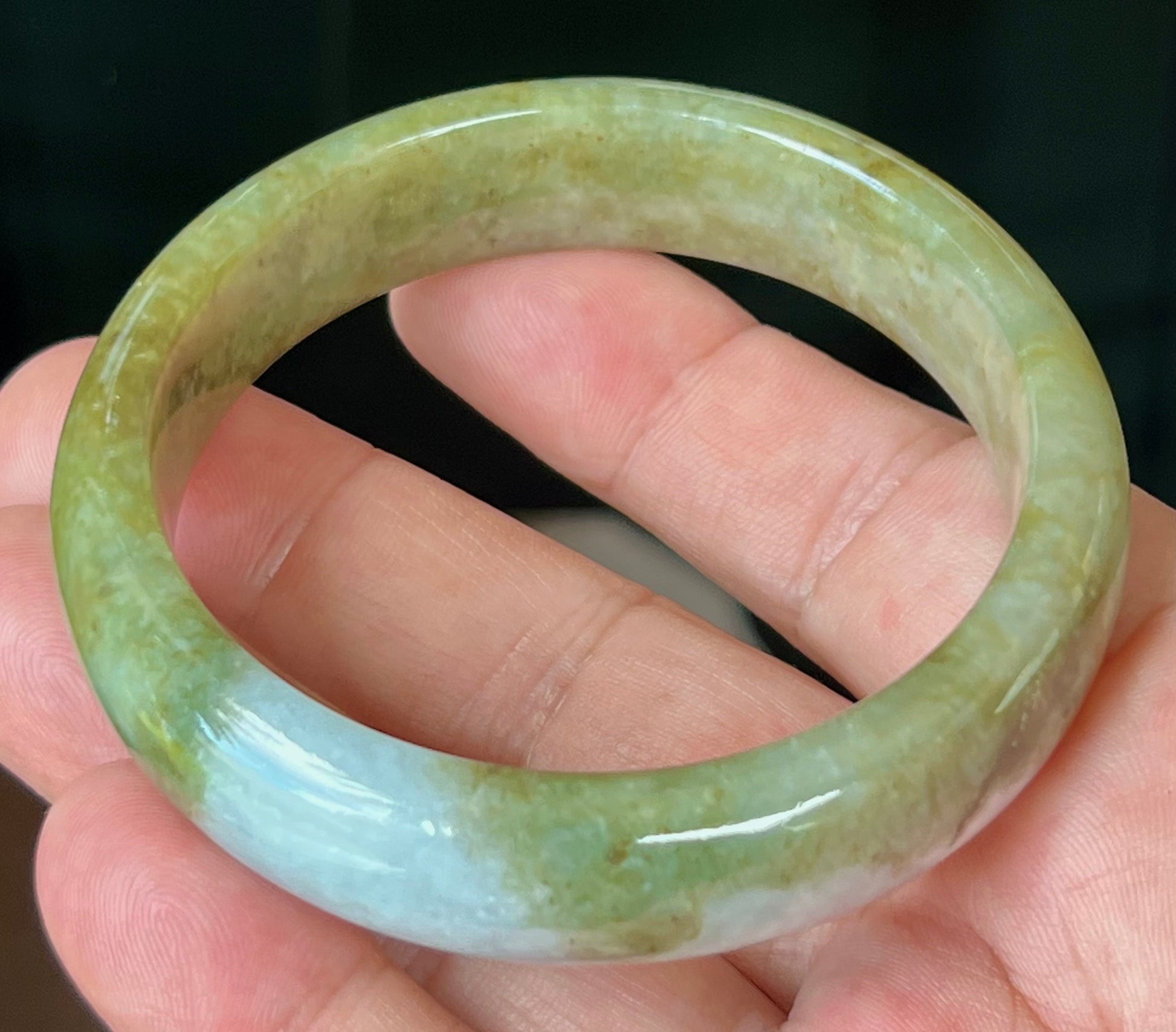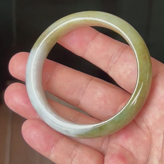 Natural Certified Burmese Jadeite Jade Bangle – Icy Apple Green and Honey Hues with Greyish Milky White Tones – 58.6mm – JB521