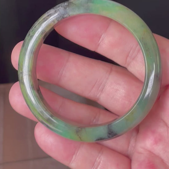 This certified jadeite jade bangle is expertly handcrafted from 100% genuine, natural Burmese jadeite, showcasing a vibrant and rare palette. The bangle features a glowing mix of icy apple green and lush imperial green, beautifully accented by deep black patterns and golden honey hues. Its dynamic, semi-translucent body has a refined crystalline structure and glassy surface luster, making each angle shimmer with complexity.