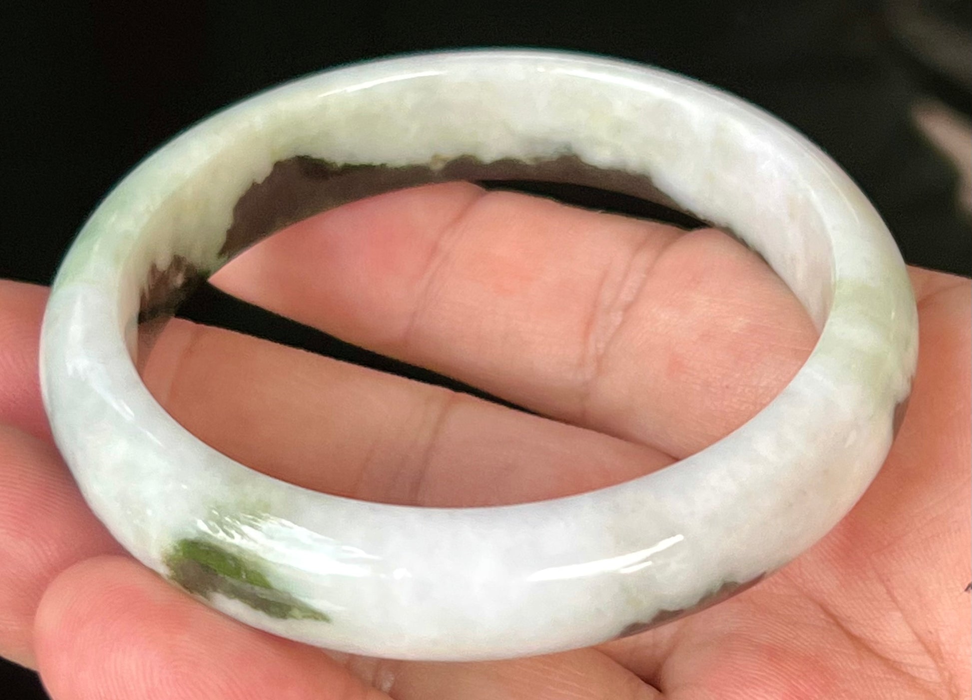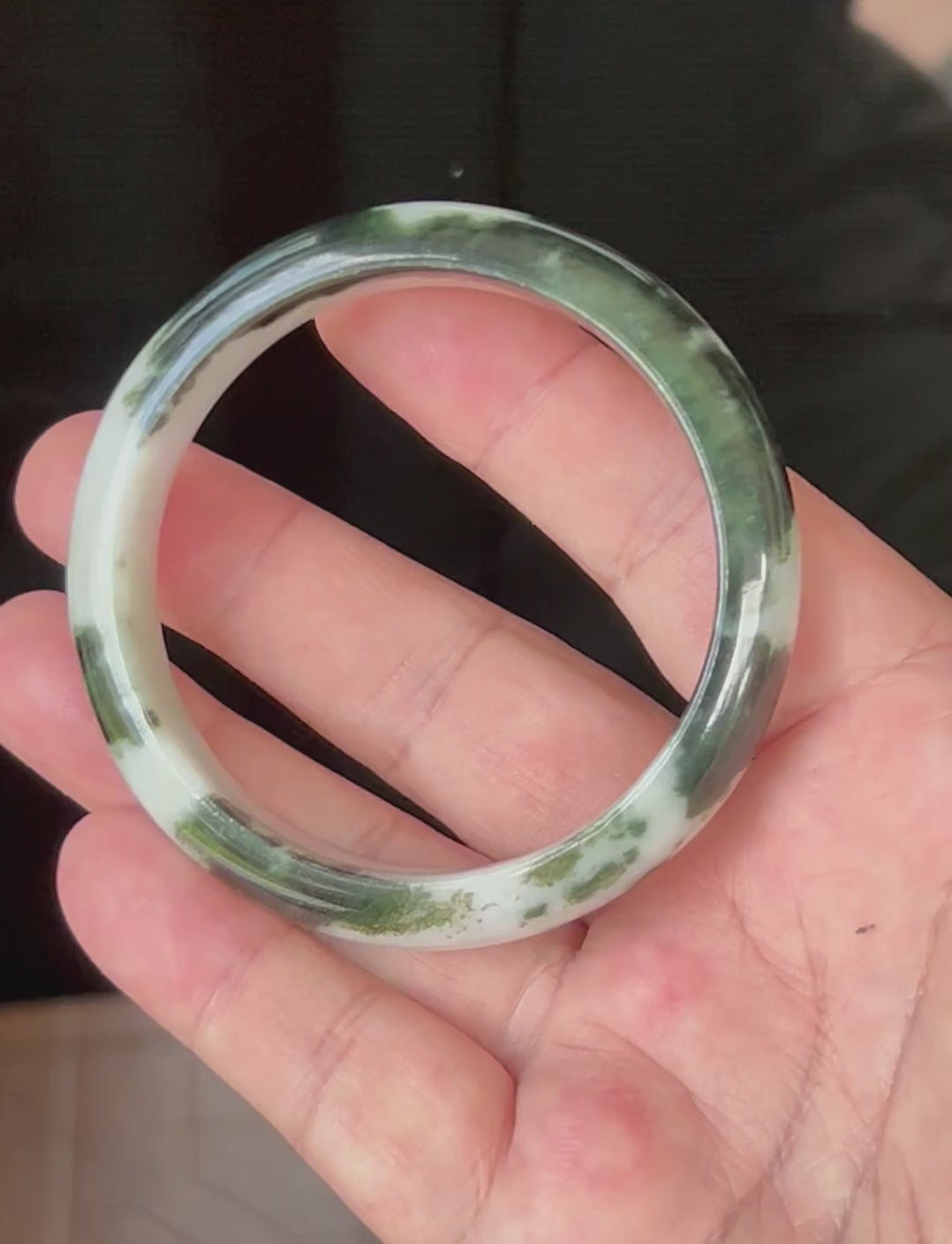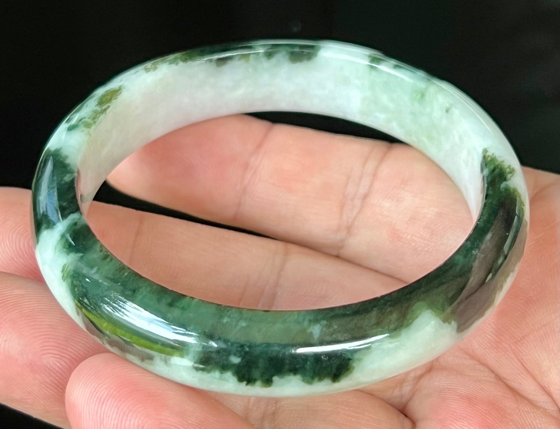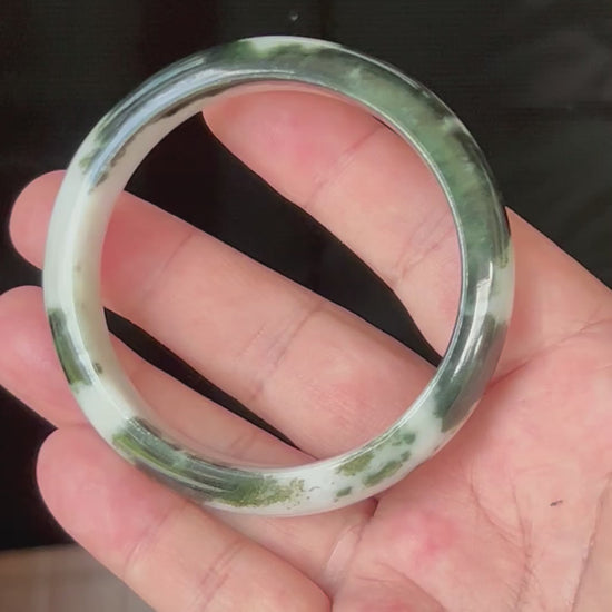 This certified jadeite jade bangle is skillfully handcrafted from 100% genuine, natural Burmese jadeite. The bangle features a striking interplay of deep forest green and icy milky white, creating bold color contrast and natural flow. Lush green patterns swirl through the classic, semi-translucent white base, giving the bangle a dramatic yet soothing look that glows beautifully in daylight. Its dense crystalline texture and glassy luster highlight the natural beauty and character unique to premium Burmese jadeite.