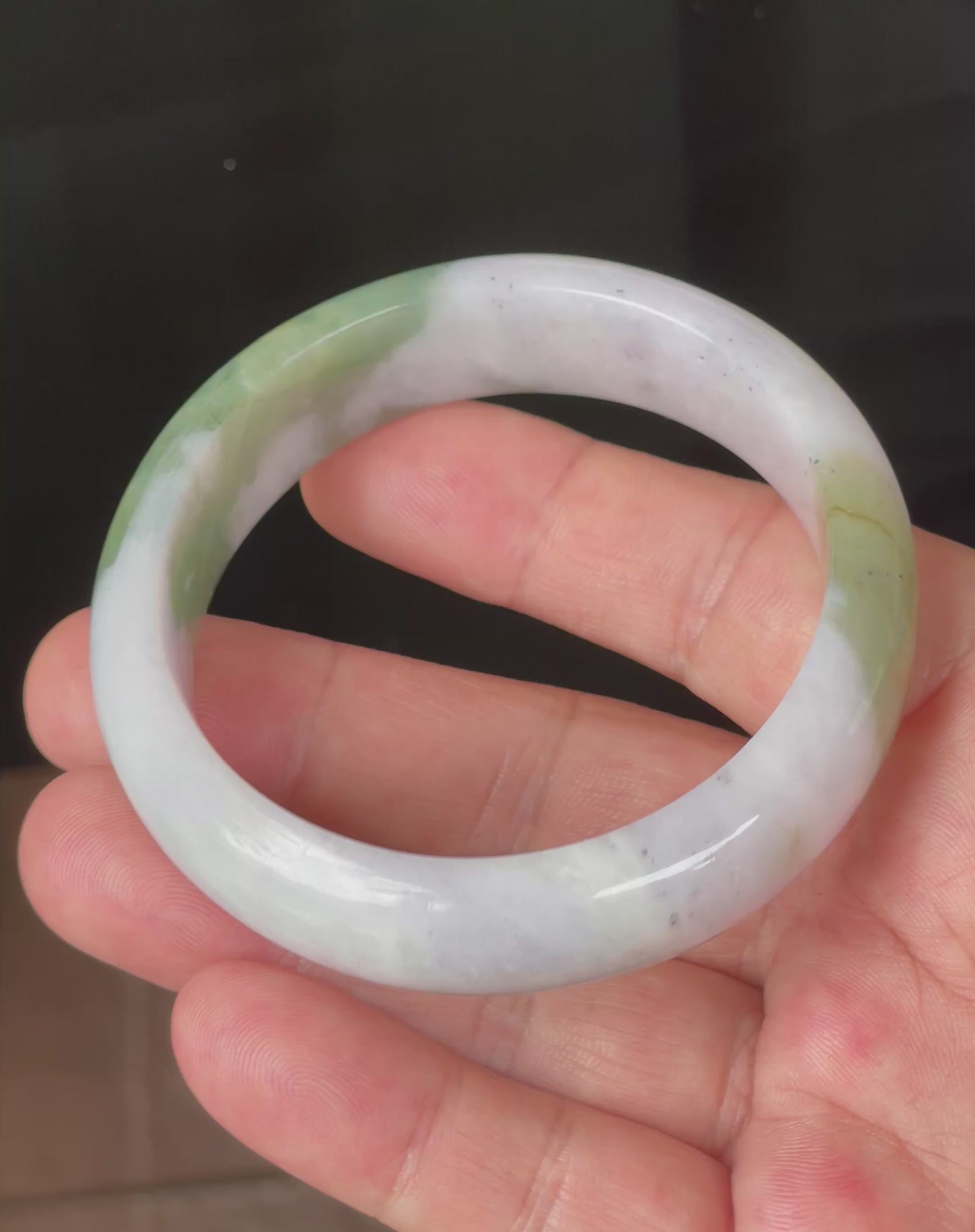 This certified jadeite jade bangle is masterfully handcrafted from 100% genuine, natural jadeite sourced from Myanmar (Burma). The bangle features a striking “moss in the snow” pattern, blending icy greyish milky white with fresh apple green and deeper forest green hues. Its fine crystalline structure and glassy luster glow beautifully in natural light, bringing out the unique marbling and layers of green across the surface.