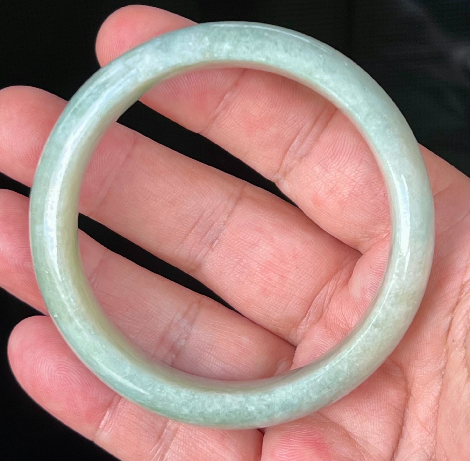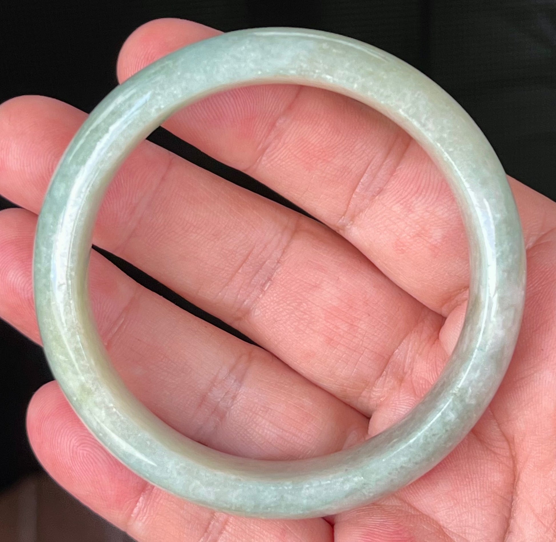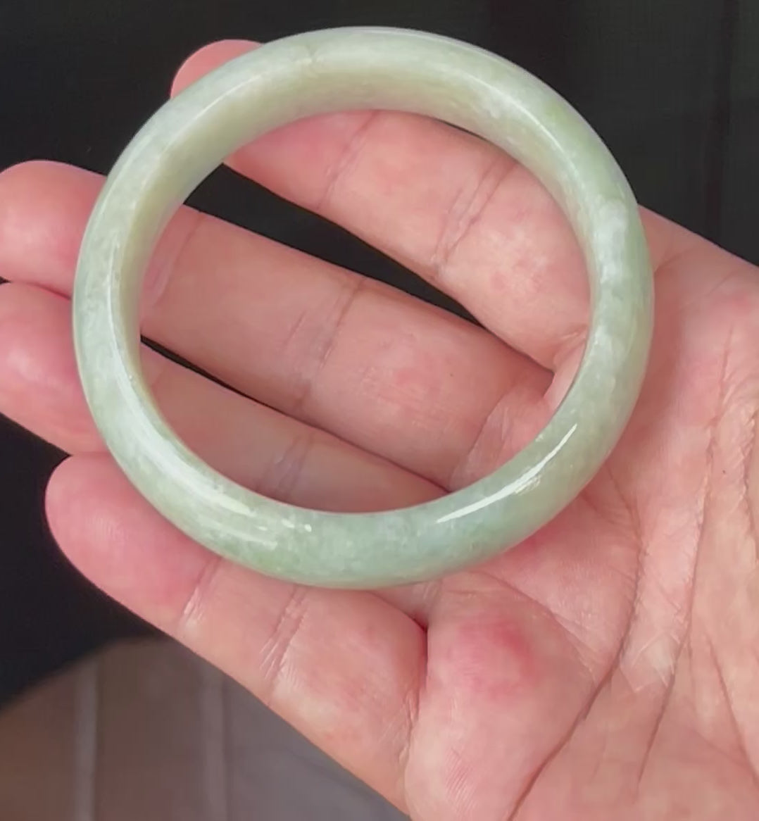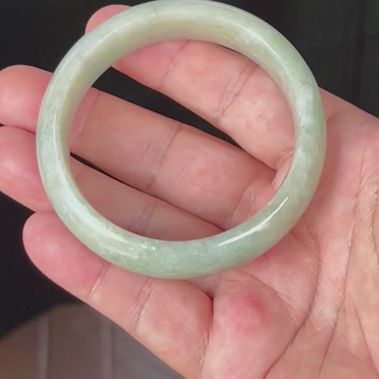 This certified jadeite jade bangle is meticulously handcrafted from 100% natural Burmese jadeite. It features a serene blend of icy light apple green and gentle milky white hues. The surface displays a fine crystalline texture, with delicate greens and luminous whites swirling in a soothing, harmonious pattern. Its glassy luster and semi-translucent quality highlight both the exceptional purity of the jade and the artistry behind its creation.
