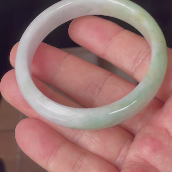 This certified jadeite jade bangle is exquisitely handcrafted from 100% genuine, natural Burmese jadeite. It displays a luminous palette of icy light lavender and milky white, accented by refreshing apple green and rich imperial green swirls. The surface glows with a fine crystalline structure and beautiful glassy luster, giving it a radiant, semi-translucent appearance. Delicate, natural inner stone lines add character and authenticity to the bangle, highlighting the one-of-a-kind nature of this exceptional piece.
