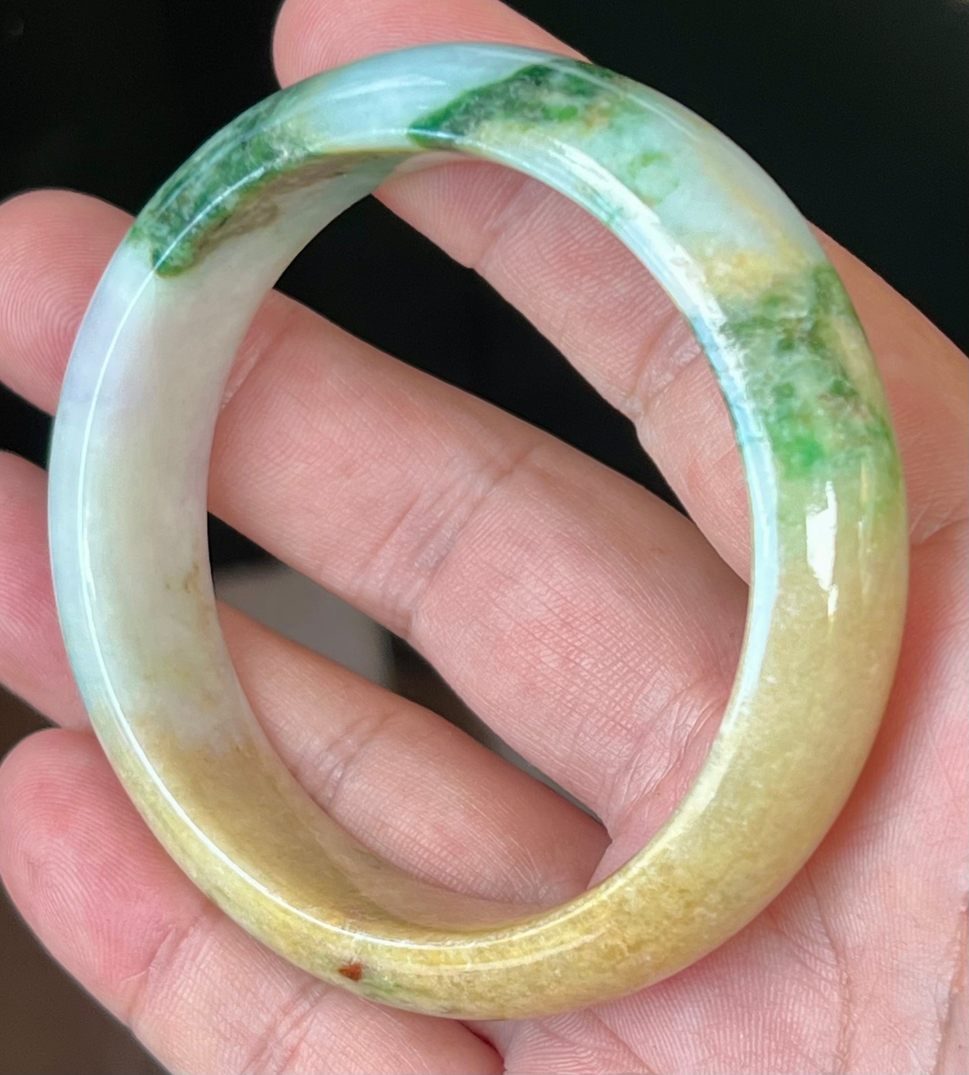 Natural Certified Burmese Jadeite Jade Bangle – Icy Milky White with Imperial Green and Honey Yellow Hues – 58mm – JB545
