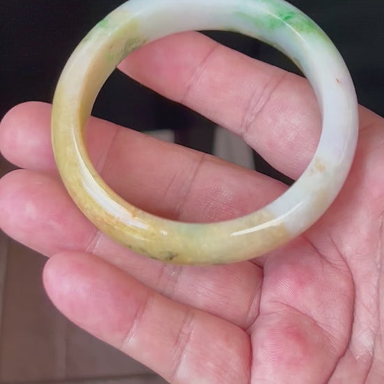 This certified jadeite jade bangle is expertly handcrafted from 100% natural Burmese jadeite. It features a striking combination of icy milky white, vivid imperial green, and rich honey yellow hues. The bangle’s surface reveals a fine crystalline texture and glowing semi-translucency, with luminous colors blending gracefully throughout. Vivid greens and golden honey tones sweep across the bangle, bringing it to life with an energizing, sunlit effect. The glassy luster and smooth finish highlight the craftsmanship and rarity of this collectible piece.