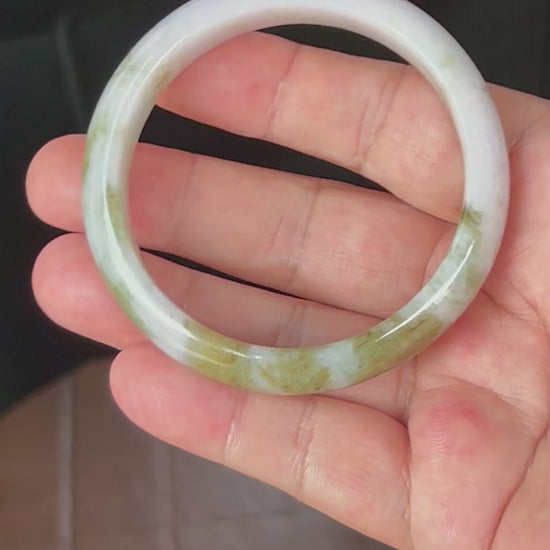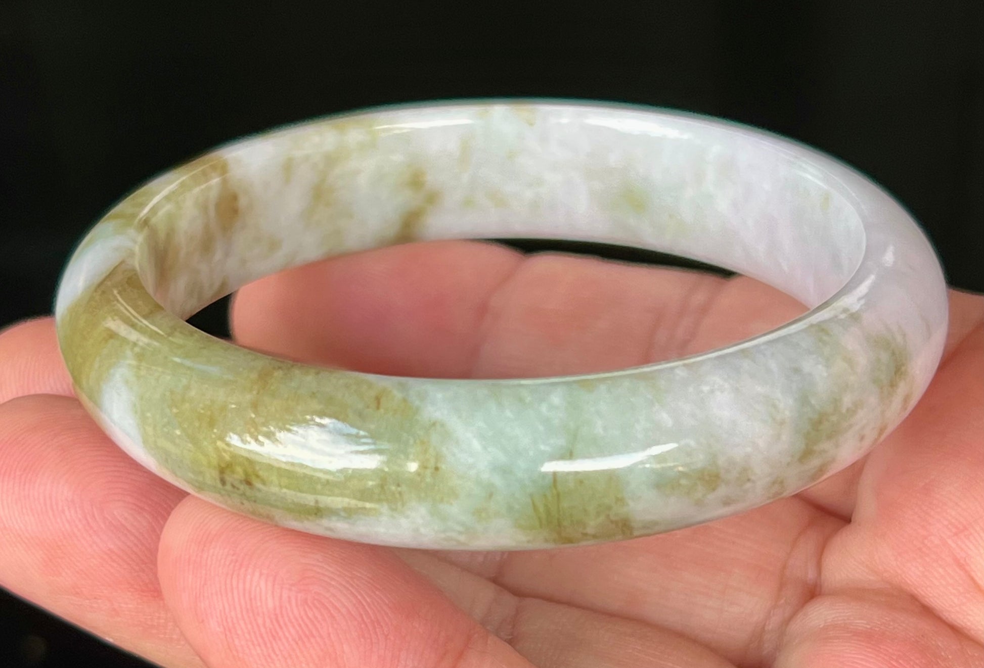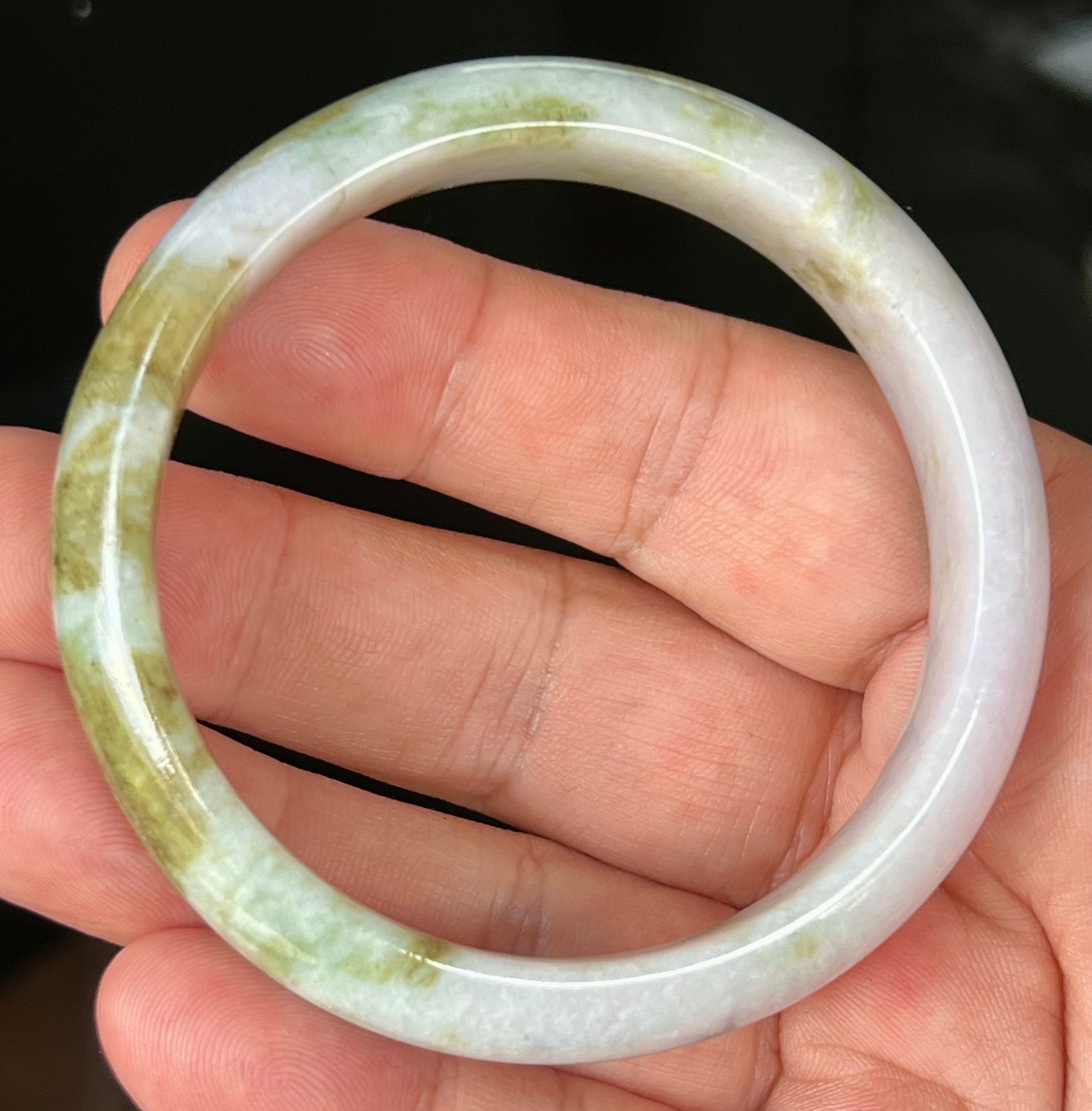 Natural Certified Burmese Jadeite Jade Bangle – Icy Milky White with Moss Green and Light Brown Hues – 58.4mm – JB535
